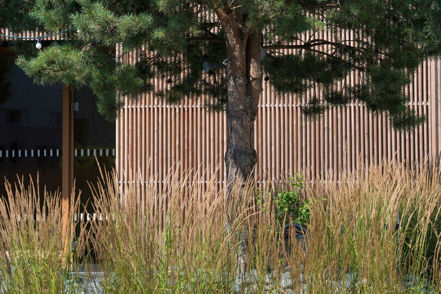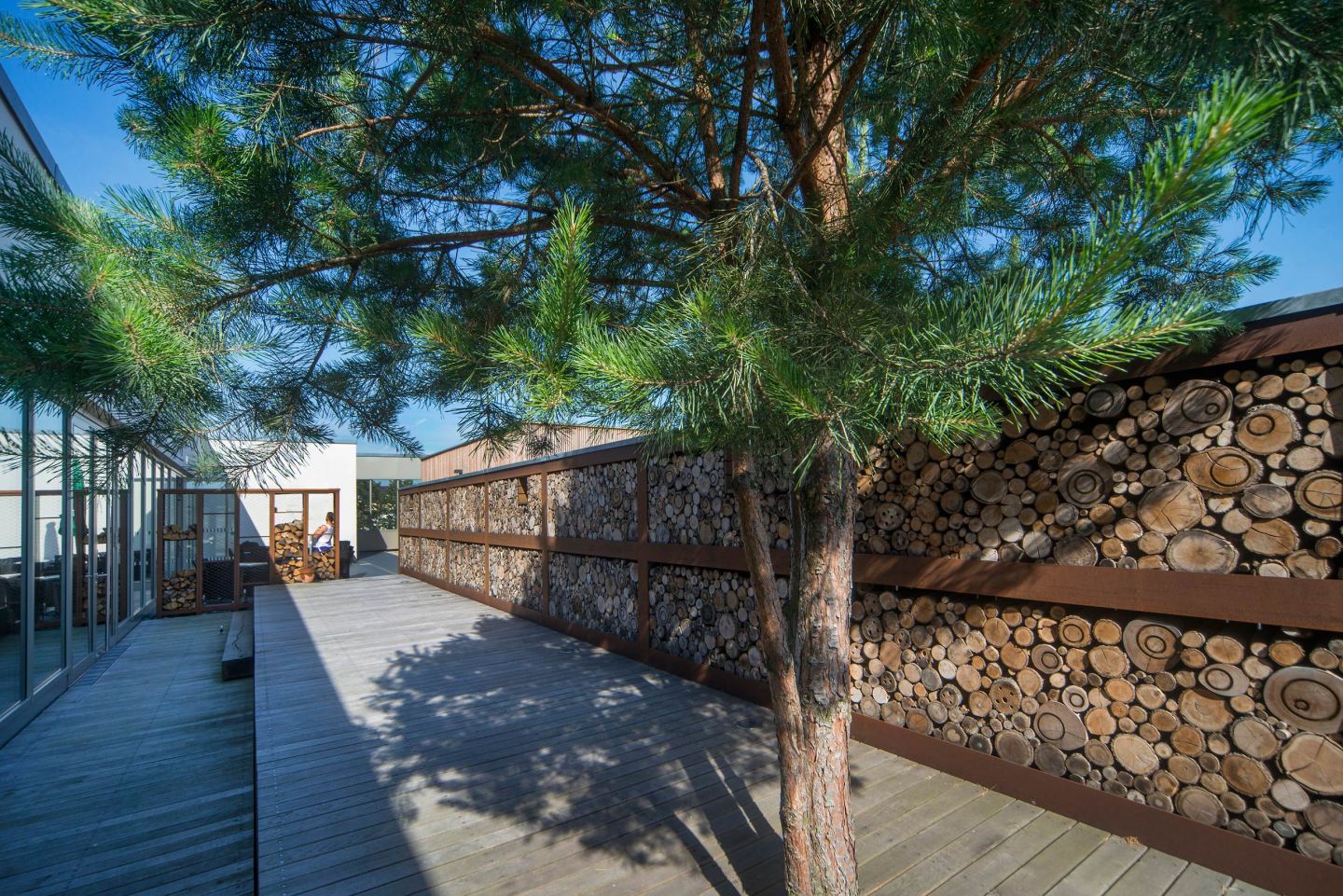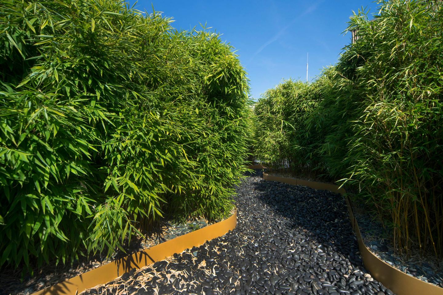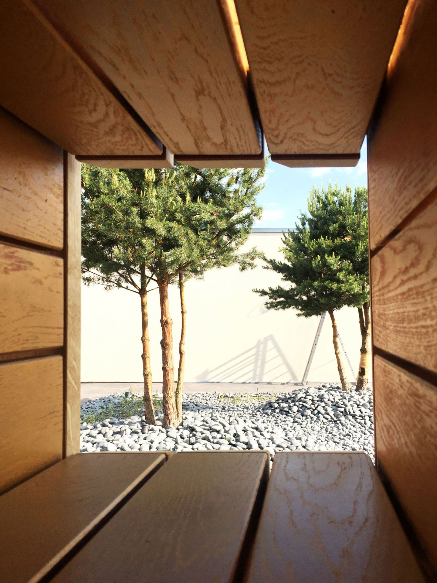 Das Dach des Baukörpers bildet mit seinen Einschnitten für Saunagarten und -becken die fünfte Fassade des Gebäudes. Die Saunalandschaft ist ein ruhiger, geschützter Ort, der zum Entspannen einlädt. Die gesamte Dachfläche wird von einer Brüstung umschlossen und durch den Einsatz von hohen Pflanzungen in unterschiedliche Räume mit variierenden Aufenthaltsqualitäten eingeteilt. Ein durchgehender Belag verbindet alle Bereiche, wird jedoch in den unterschiedlichen Erfahrungsräumen durch den Einsatz verschiedenster Oberflächenmaterialien, wie z.B. Holz,- Kies,- und Pflanzflächen, durchbrochen.