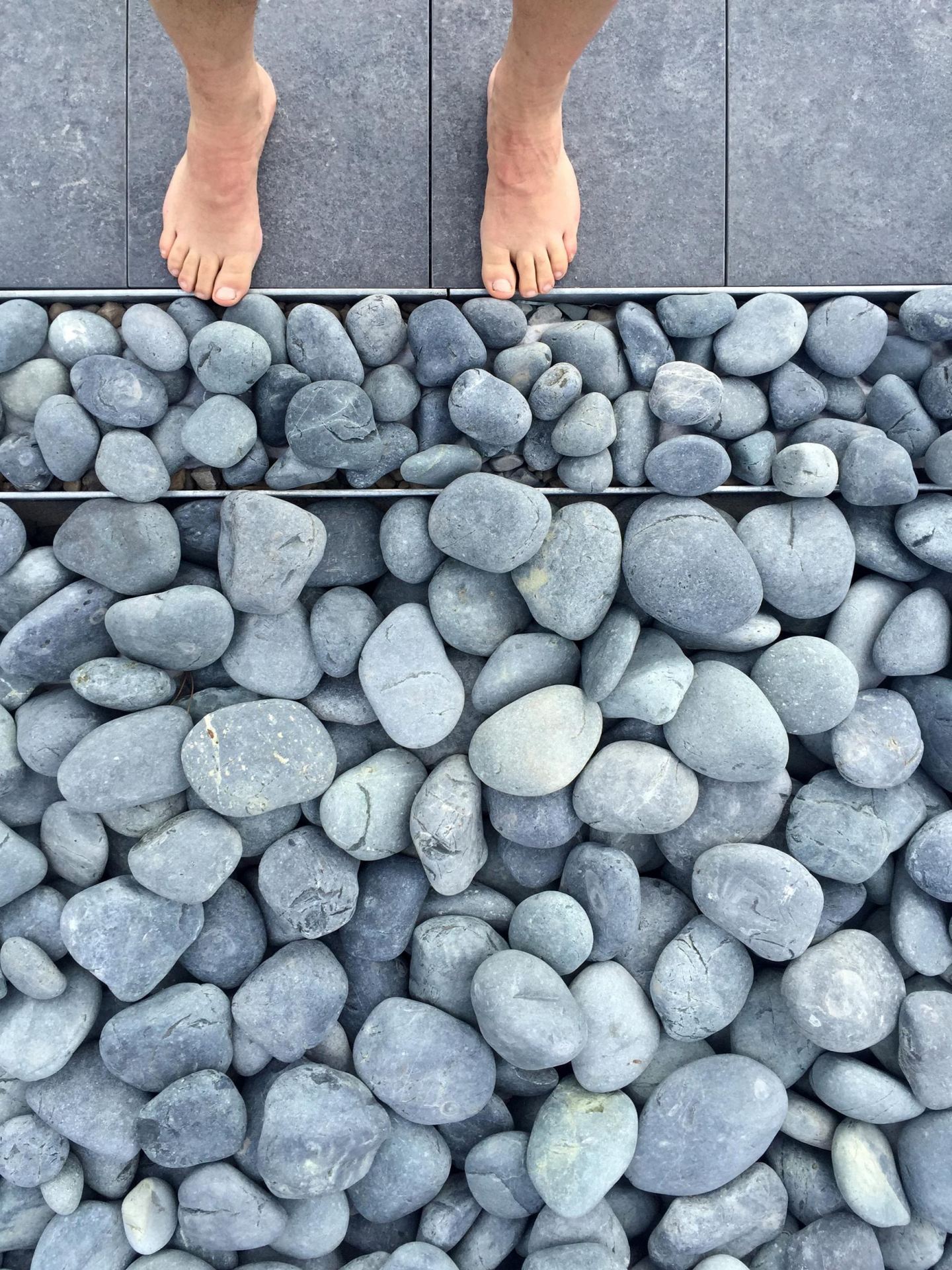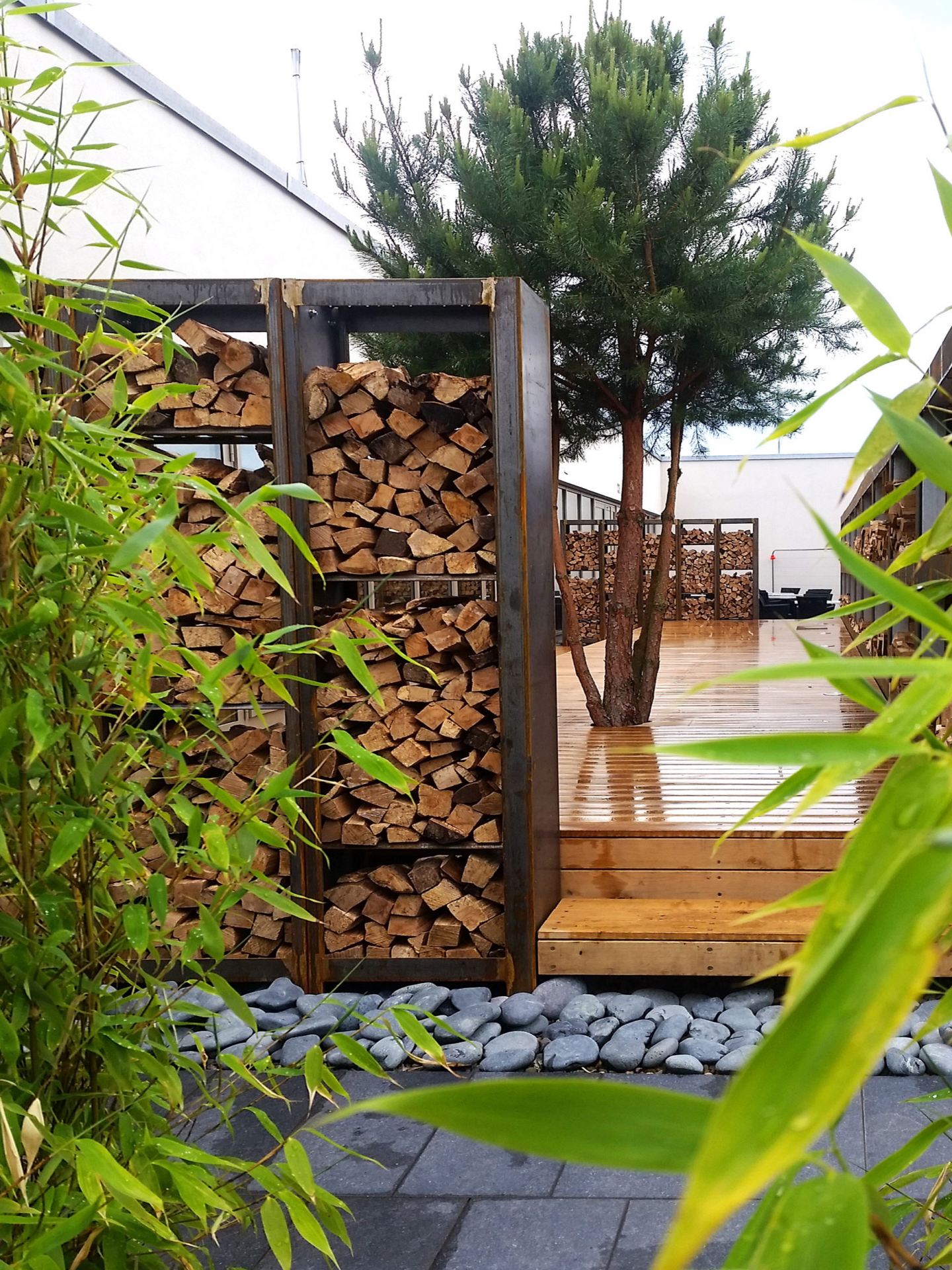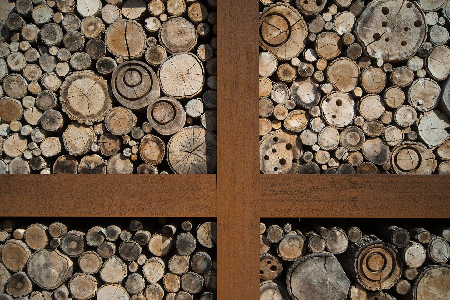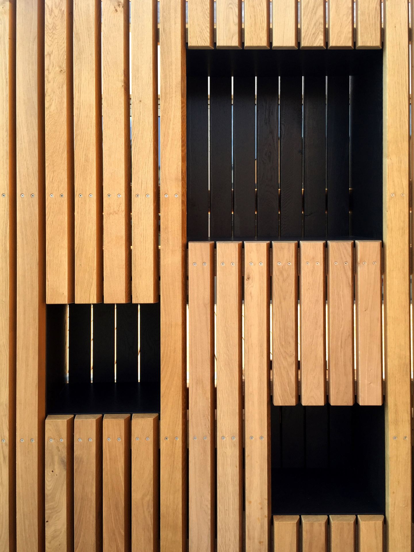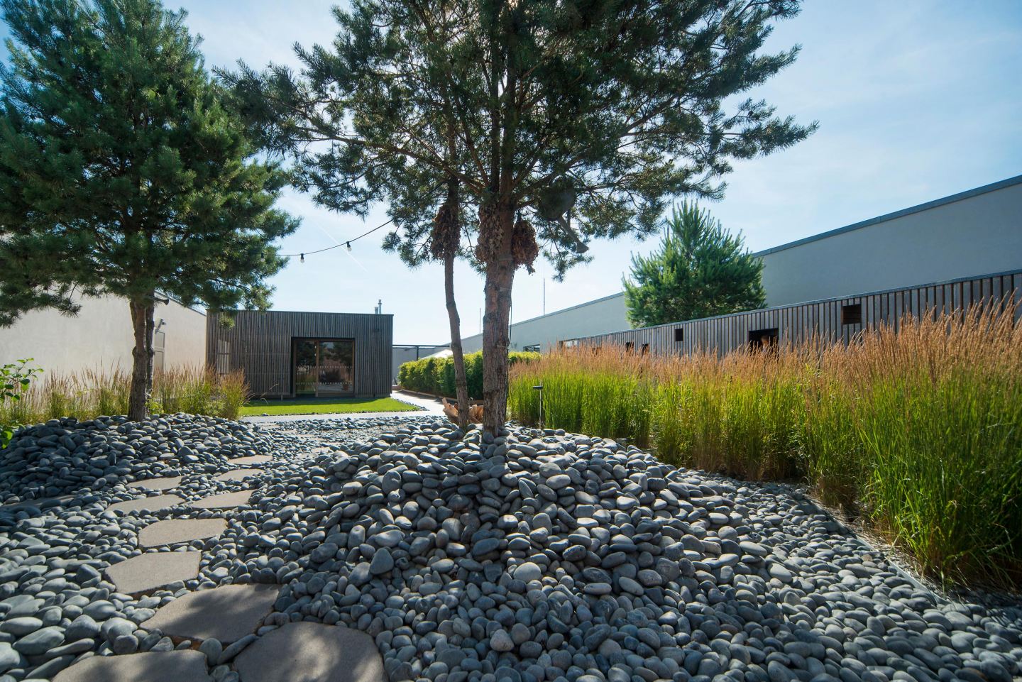 Das Dach des Baukörpers bildet mit seinen Einschnitten für Saunagarten und -becken die fünfte Fassade des Gebäudes. Die Saunalandschaft ist ein ruhiger, geschützter Ort, der zum Entspannen einlädt. Die gesamte Dachfläche wird von einer Brüstung umschlossen und durch den Einsatz von hohen Pflanzungen in unterschiedliche Räume mit variierenden Aufenthaltsqualitäten eingeteilt. Ein durchgehender Belag verbindet alle Bereiche, wird jedoch in den unterschiedlichen Erfahrungsräumen durch den Einsatz verschiedenster Oberflächenmaterialien, wie z.B. Holz,- Kies,- und Pflanzflächen, durchbrochen.