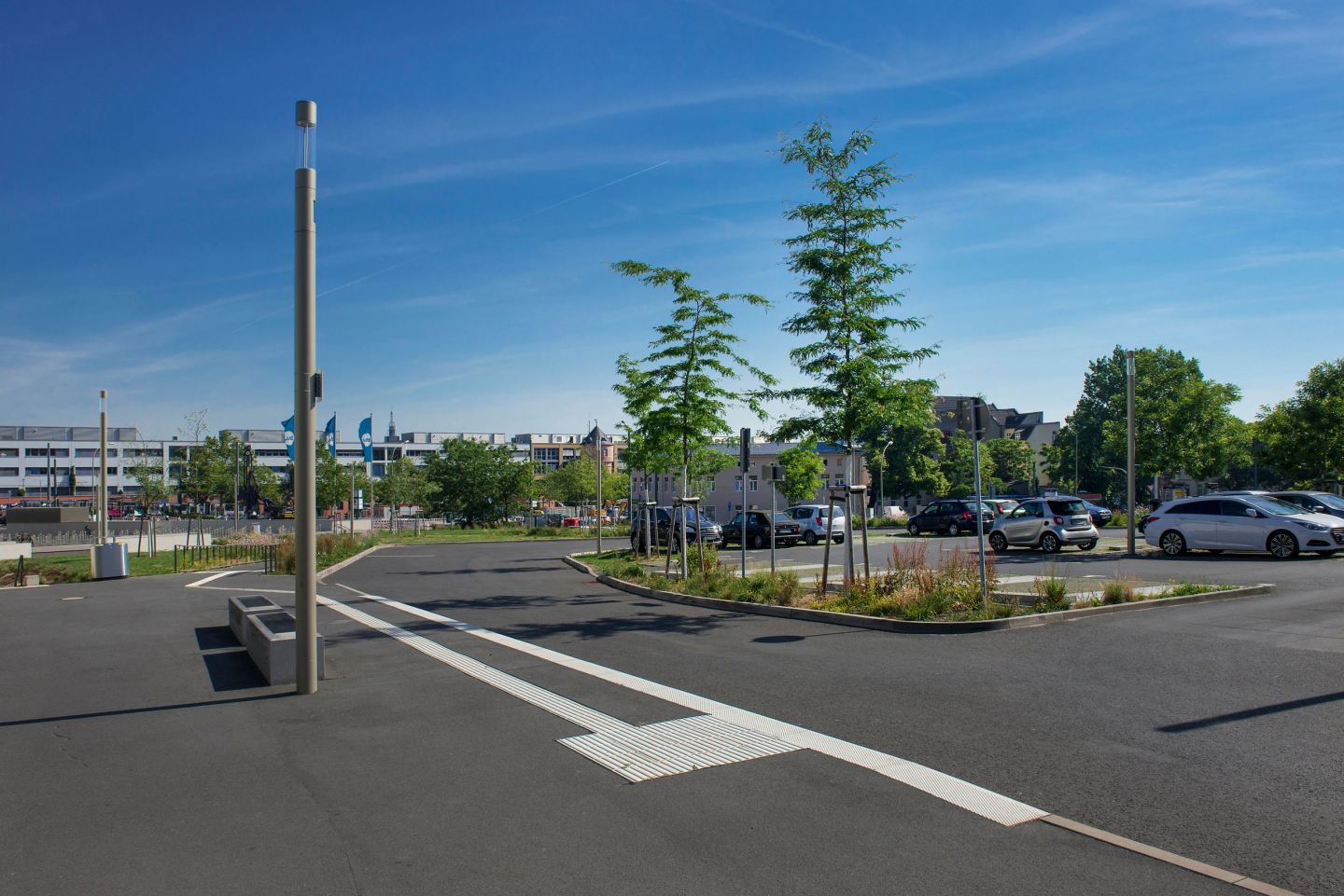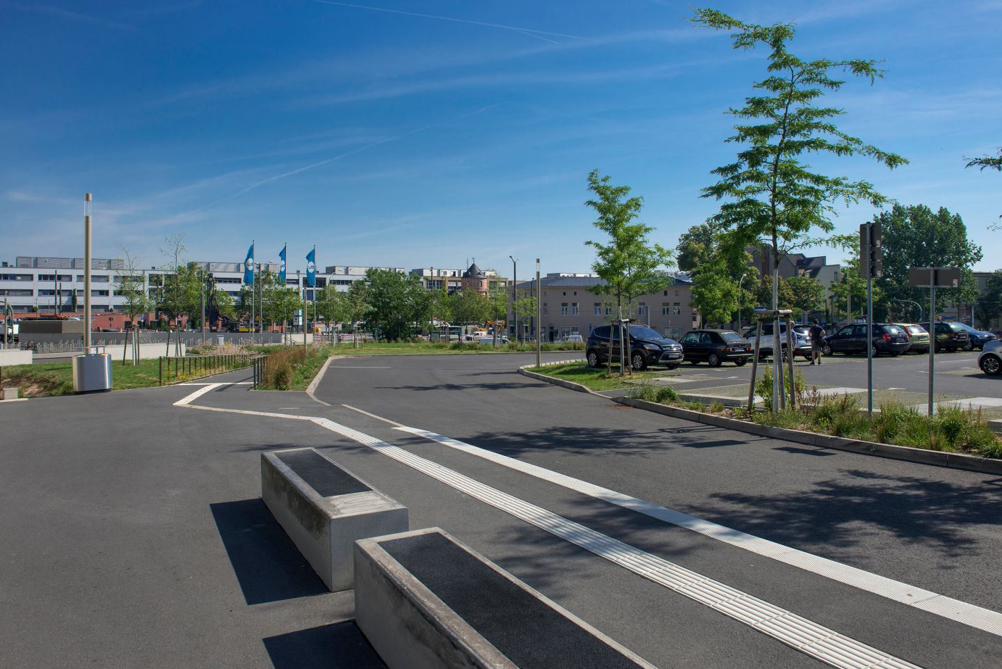 Der Haupteingang mit angeschlossenem Foyer liegt dagegen im Osten. Hier empfängt eine einladende Treppenanlage den Besucher und führt ihn auf einen großzügigen und über Straßenniveau erhabenen Vorplatz. Bistro und Foyer erzeugen auf diesem Stadtplatz eine urbane und lebhafte Atmosphäre. An die präzise gestaltete Freianlage schließt sich im Süden ein kleiner Park an, der von der Max-Planck-Straße aus das Entree zum Bad bildet. Eine sanft geneigte Grünfläche überwindet hier den Niveauunterschied zwischen Nord- und Südseite des Grundstücks.