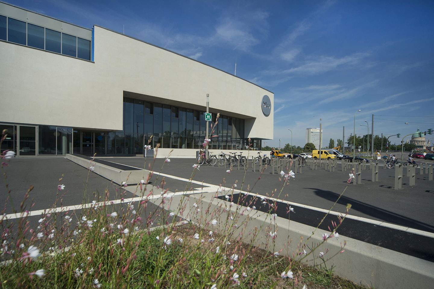 Der Außenraum definiert sich in die drei Bereiche Vorplatz und Park im Osten und Liegewiese im Westen. Mit der Setzung des kompakten Bauvolumens bis an die östliche Bau-Linie bleibt im Westen eine vor dem Straßenverkehr des lebhaften Leipziger Dreiecks geschützte Außenfläche frei: Als Liegewiese ist sie der nach Westen ausgerichteten Badelandschaft zugeordnet und profitiert so von der Nachmittags- und Abendsonne.