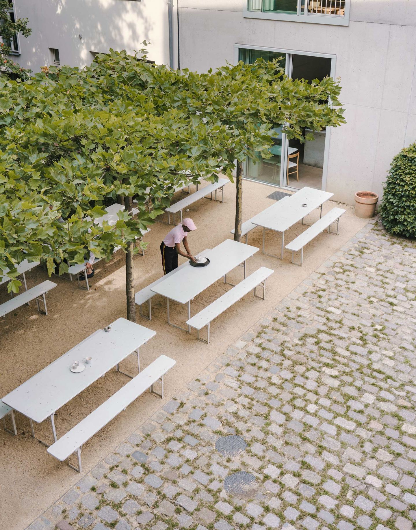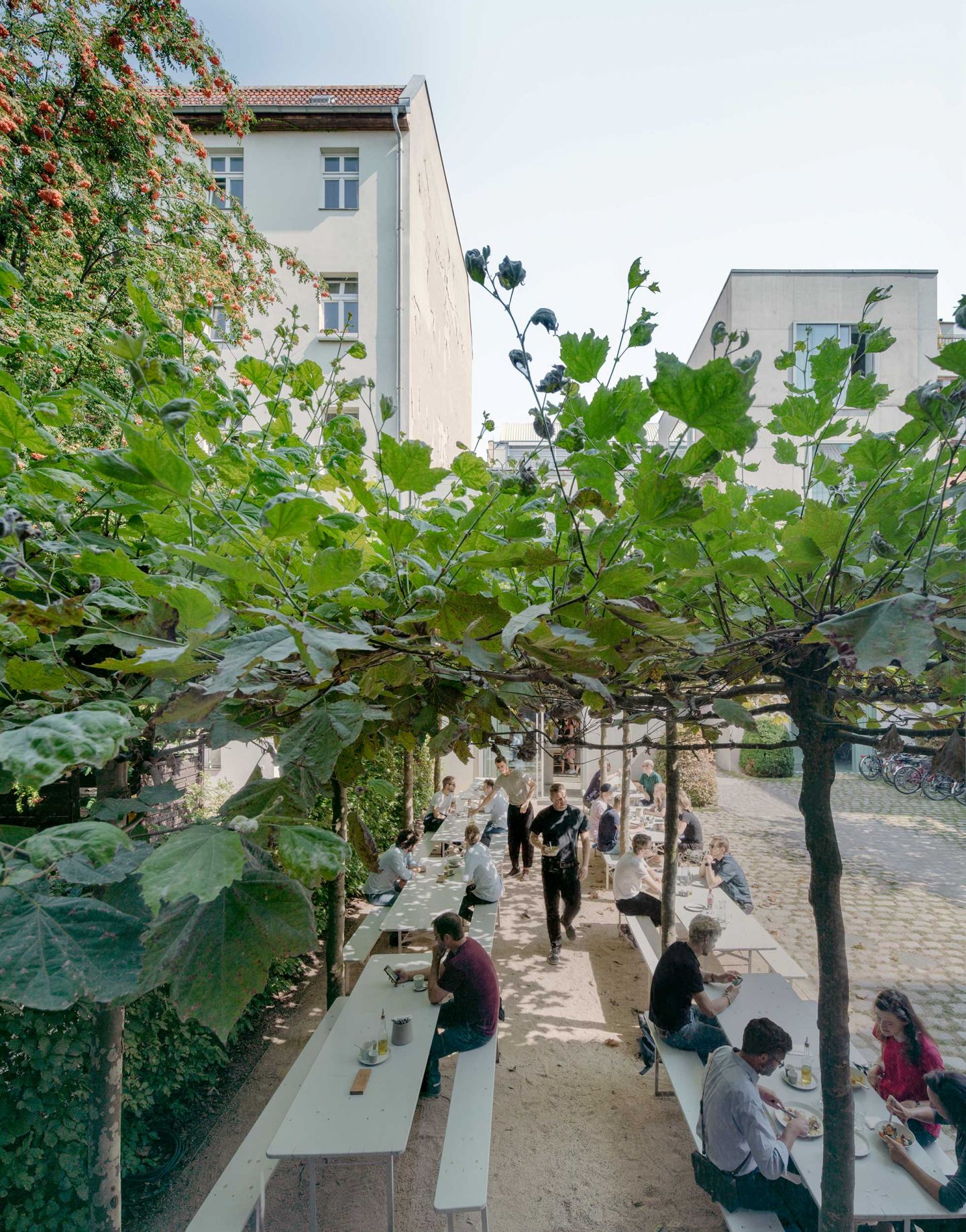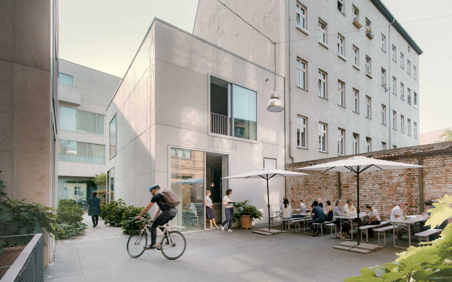Das freistehende zweigeschossige Mittelgebäude beherbergt eine Kantine. Zusammen mit dem Gartenhof entsteht ein halböffentlicher Platz für Geselligkeit und Dialog, der den Ort in eine Campus-ähnliche Atmosphäre taucht. Der Außenraum, entworfen von Peter Wirtz, erweitert den Innenraum und bildet mit seinen Pflanzen und Materialien einen Kontrapunkt zur monolithischen Architektur.