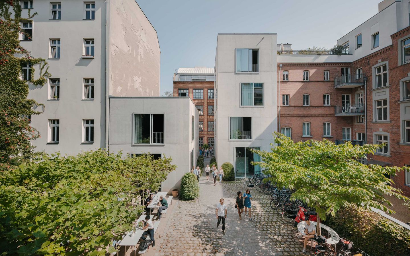 Auf dem Gelände einer ursprünglich 1895 erbauten Klavierfabrik befindet sich das Berliner Büro von David Chipperfield Architects. Im Zuge der Erweiterung der bestehenden Büroräume erhielt das fünfgeschossige Backsteingebäude im hinteren Teil vier weitere Etagen, während der vierstöckige, kubisch-schlichte Betonneubau als Vorderhaus zur Straßenseite abschließt. Aufstockung und Blockrandschließung kreieren zugleich einen neuen Blockinnenraum, der als fließender Außenraum die geschaffenen Höfe miteinander verknüpft und in seiner Typologie gezielt die typische Berliner Hofstruktur aufgreift.