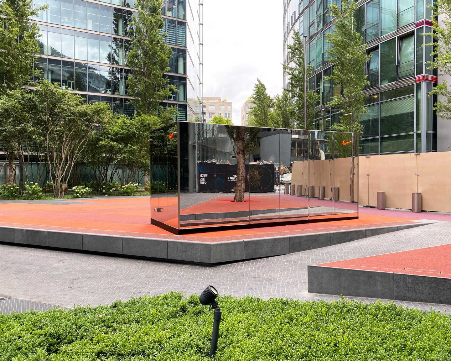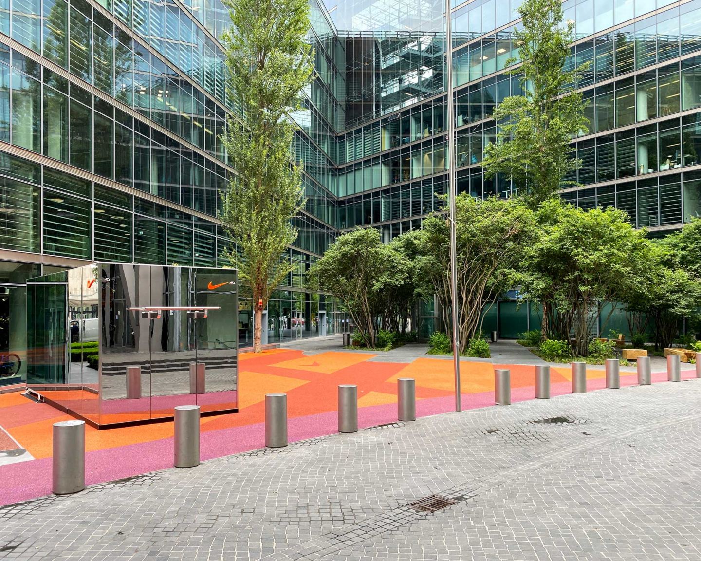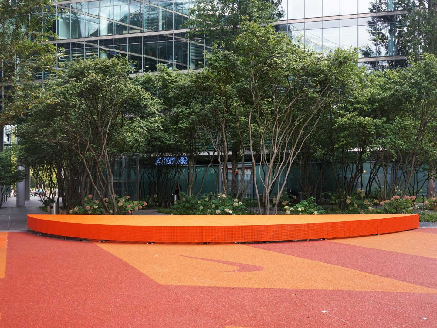 Die Monumentalität der 40 Meter hohen Glasfassaden erfordert eine neue Intimität im menschlichen Maßstab. Die Geometrie des Raumes bleibt bewahrt, doch unterscheiden sich seine Inhalte. Artenvielfalt, Jahreszeitenwechsel und Farbintensität wollen Hoffnungsträger sein. Aus einstigen Buchsbaumhecken sind Pflaster oder mit Bäumen bepflanzte Flächen geworden, eine farbige Oberfläche und ein dichter Wald aus skulpturalen Bäumen. Fahnenmasten aus rostfreiem Stahl wurden in Flutlichtmasten umgewandelt, die eine Bewegungsfläche inszenieren. Dem darunter liegenden Lüftungsgitter folgt eine zwölf Meter lange Sitzbank in Form eines Halbmondes aus leuchtend orangefarbenem Gitter. Im Sportbereich fasziniert ein 6-Fuß-Container, der vollständig mit verspiegelten Edelstahlplatten verkleidet ist.