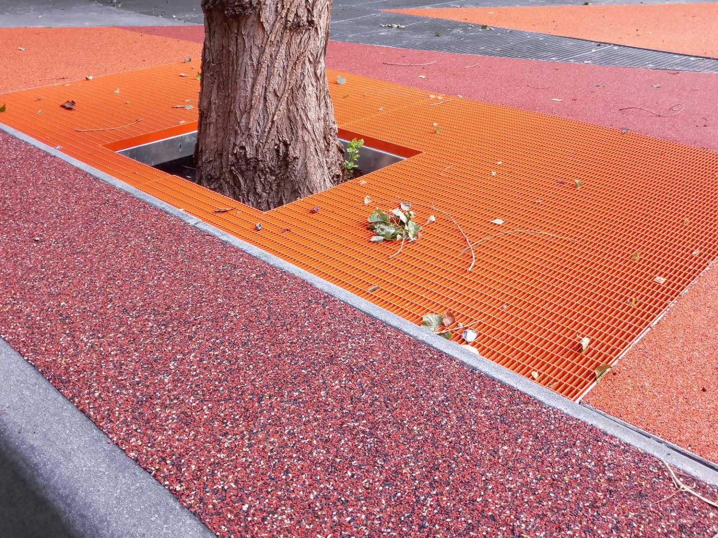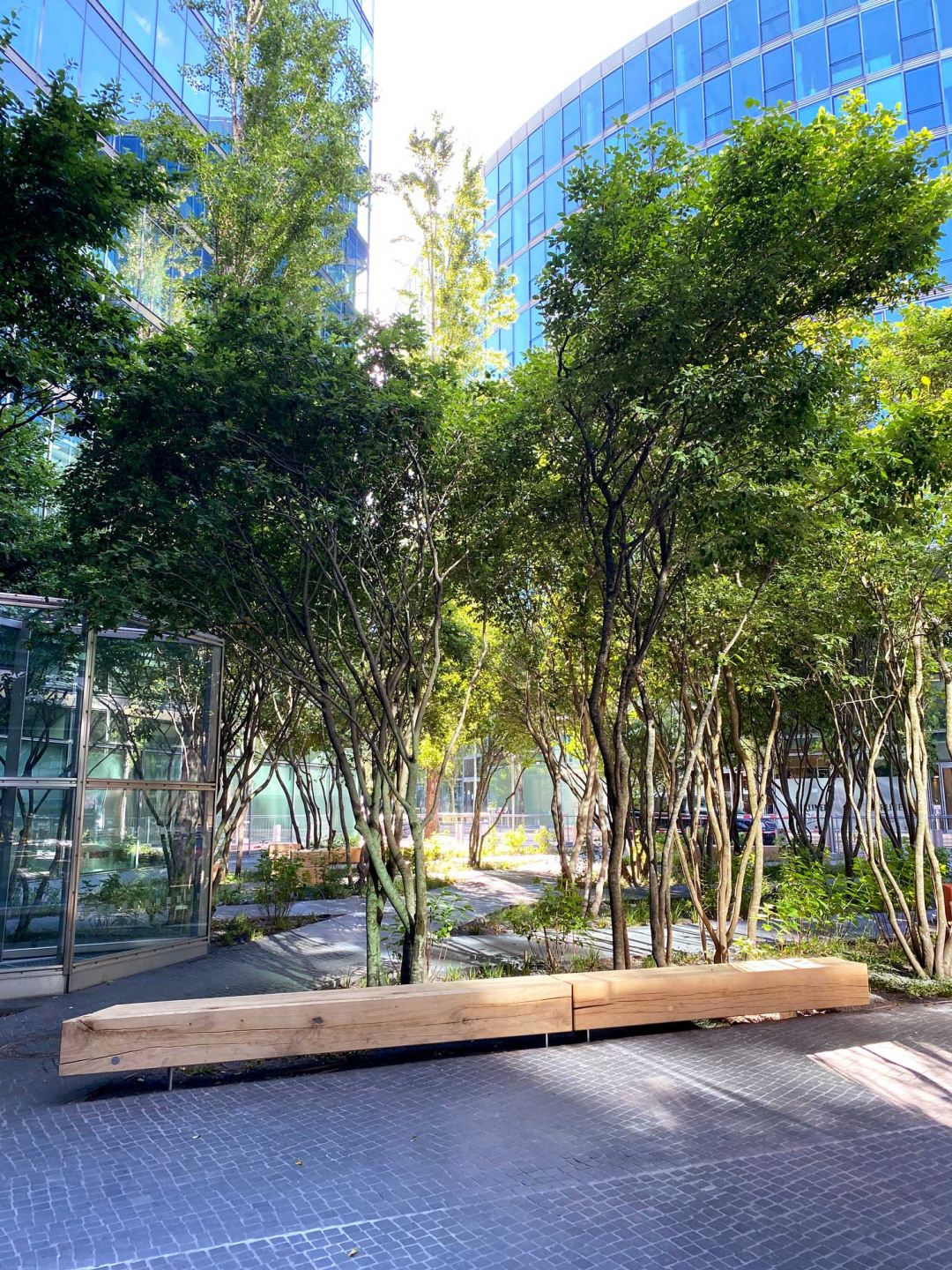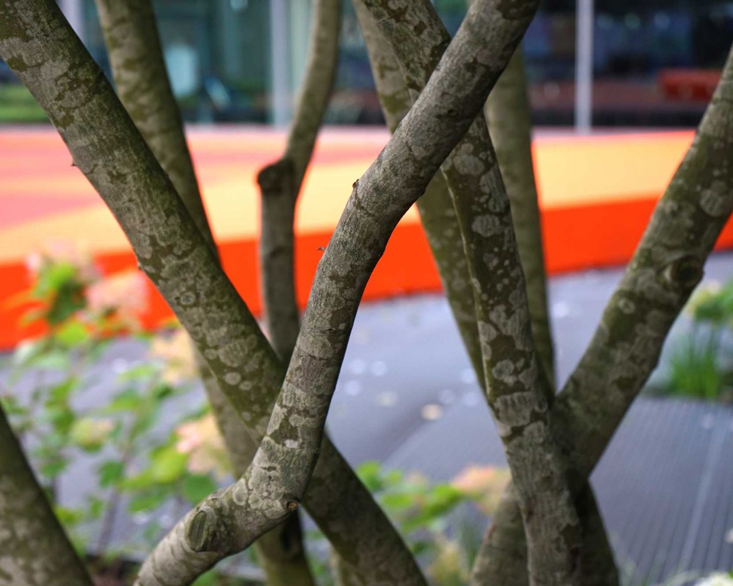 Die Monumentalität der 40 Meter hohen Glasfassaden erfordert eine neue Intimität im menschlichen Maßstab. Die Geometrie des Raumes bleibt bewahrt, doch unterscheiden sich seine Inhalte. Artenvielfalt, Jahreszeitenwechsel und Farbintensität wollen Hoffnungsträger sein. Aus einstigen Buchsbaumhecken sind Pflaster oder mit Bäumen bepflanzte Flächen geworden, eine farbige Oberfläche und ein dichter Wald aus skulpturalen Bäumen. Fahnenmasten aus rostfreiem Stahl wurden in Flutlichtmasten umgewandelt, die eine Bewegungsfläche inszenieren. Dem darunter liegenden Lüftungsgitter folgt eine zwölf Meter lange Sitzbank in Form eines Halbmondes aus leuchtend orangefarbenem Gitter. Im Sportbereich fasziniert ein 6-Fuß-Container, der vollständig mit verspiegelten Edelstahlplatten verkleidet ist.