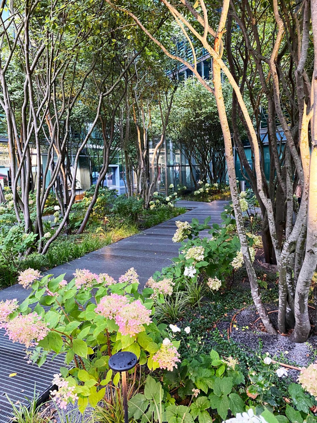 Die Bepflanzung folgt einem durchdachten, ökologischem Konzept: Schattenverträgliche Baumarten wie Fagus sylvatica (Rotbuche) oder Acer griseum (Zimt-Ahorn) sorgen für Kühlung, während Stauden mit gestaffelten Blütezeiten, Insekten Nahrung bieten. So entsteht ein lebendiges Mikroklima – ganzjährig attraktiv und ökologisch wertvoll.