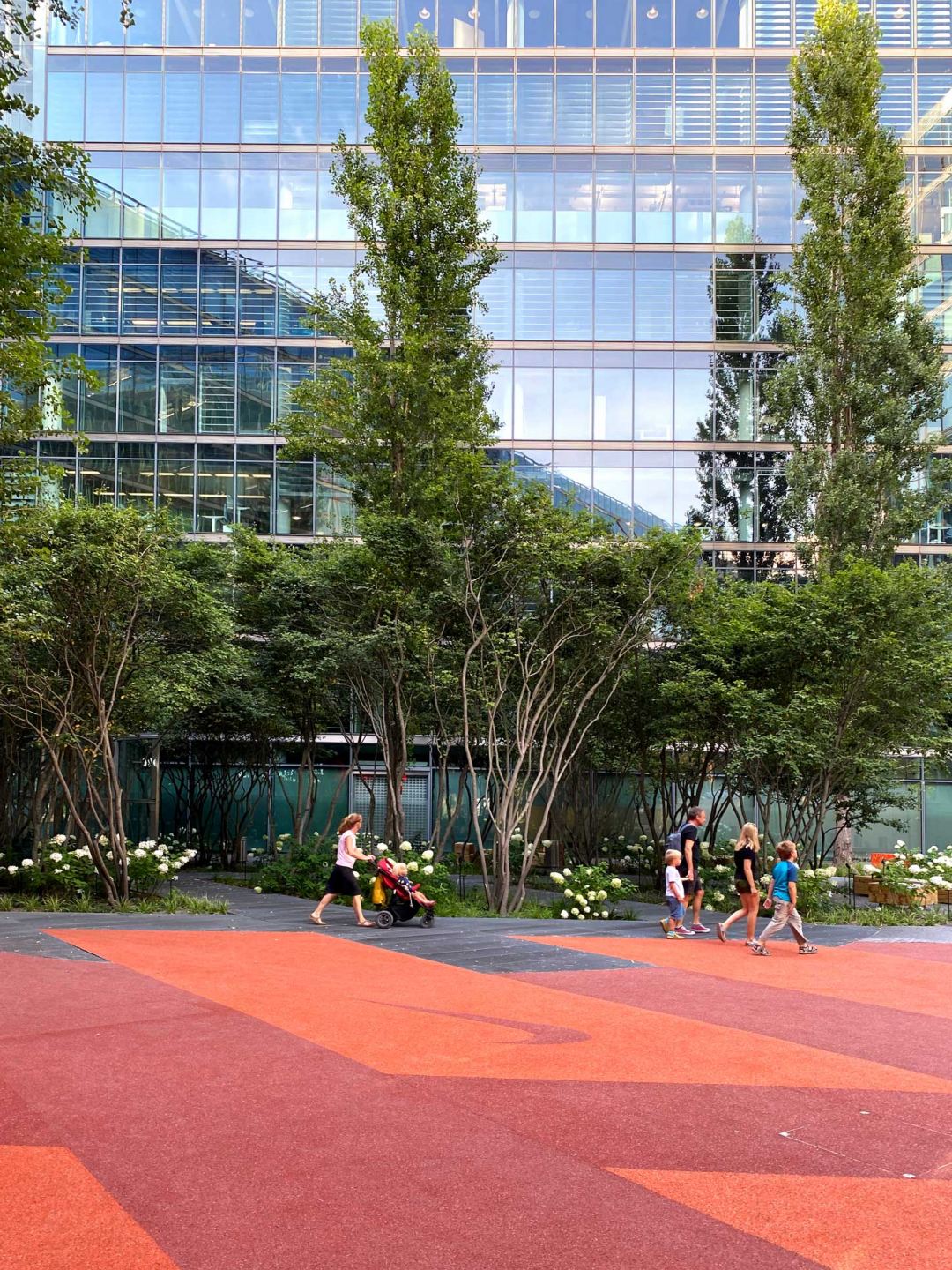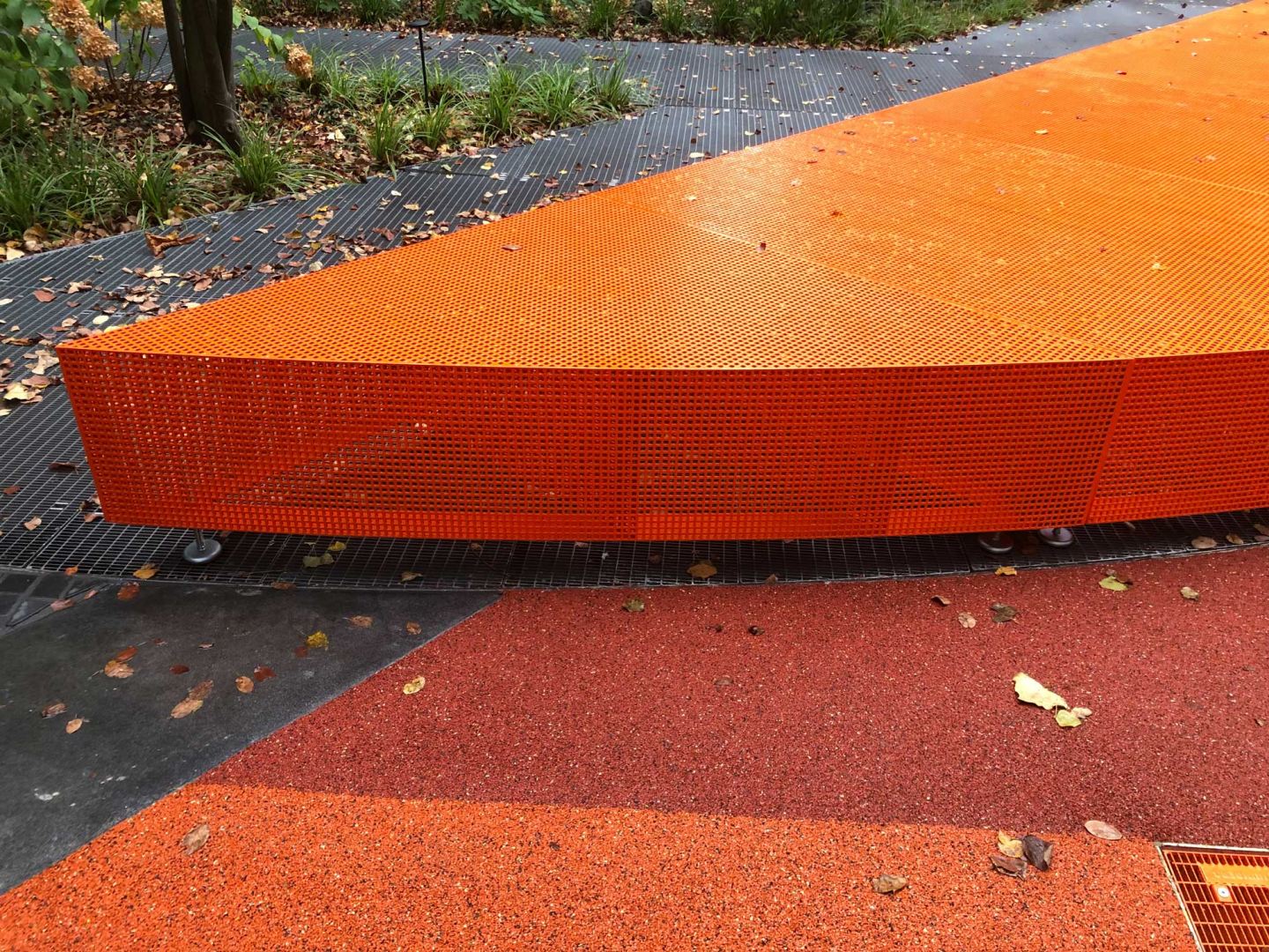 Der Sportbereich wird von einem Natursteinblock eingefasst, der als Sitzfläche dient. Die Laufbahn entstand aus sogenanntem Nike Grind, ein Granulat aus zermahlenen Schuhsohlen mit Epoxidharzen überzogen. Der angrenzende schattige Hain von Amelanchier lamarckii beherbergt verstreute Sitzgelegenheiten aus Eichenstämme in verschiedenen Größen. Ab nächstem Jahr wird eine Bar mit langer Steintafel einen weiteren Ruhepunkt bieten.