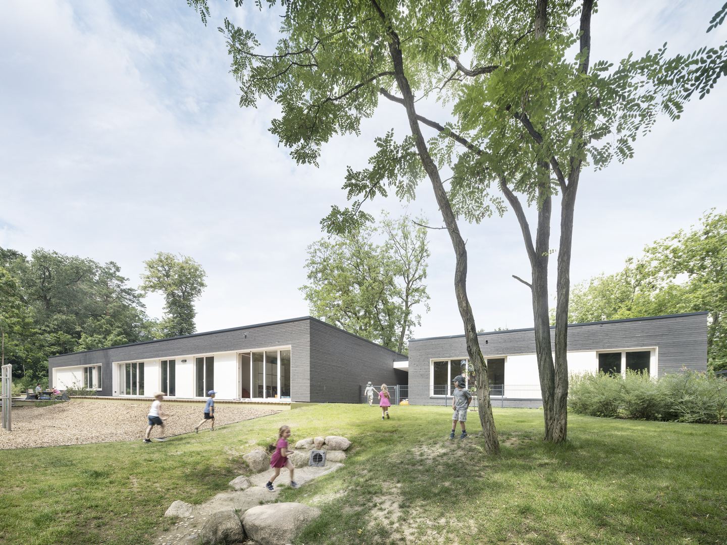 Auch die Außenanlagen öffnen sich in alle vier Himmelsrichtungen und schaffen fließende Übergänge zwischen drinnen und draußen. Vielfältige Spiel- und Bewegungsangebote, naturnahe Pflanzungen und liebevoll gestaltete Aufenthaltsbereiche laden zum Erkunden, Entdecken und Verweilen ein. Dabei wurde besonderer Wert auf Nachhaltigkeit und die Förderung der kindlichen Sinne gelegt – mit natürlichen Materialien, abwechslungsreicher Bepflanzung und viel Raum für Kreativität.