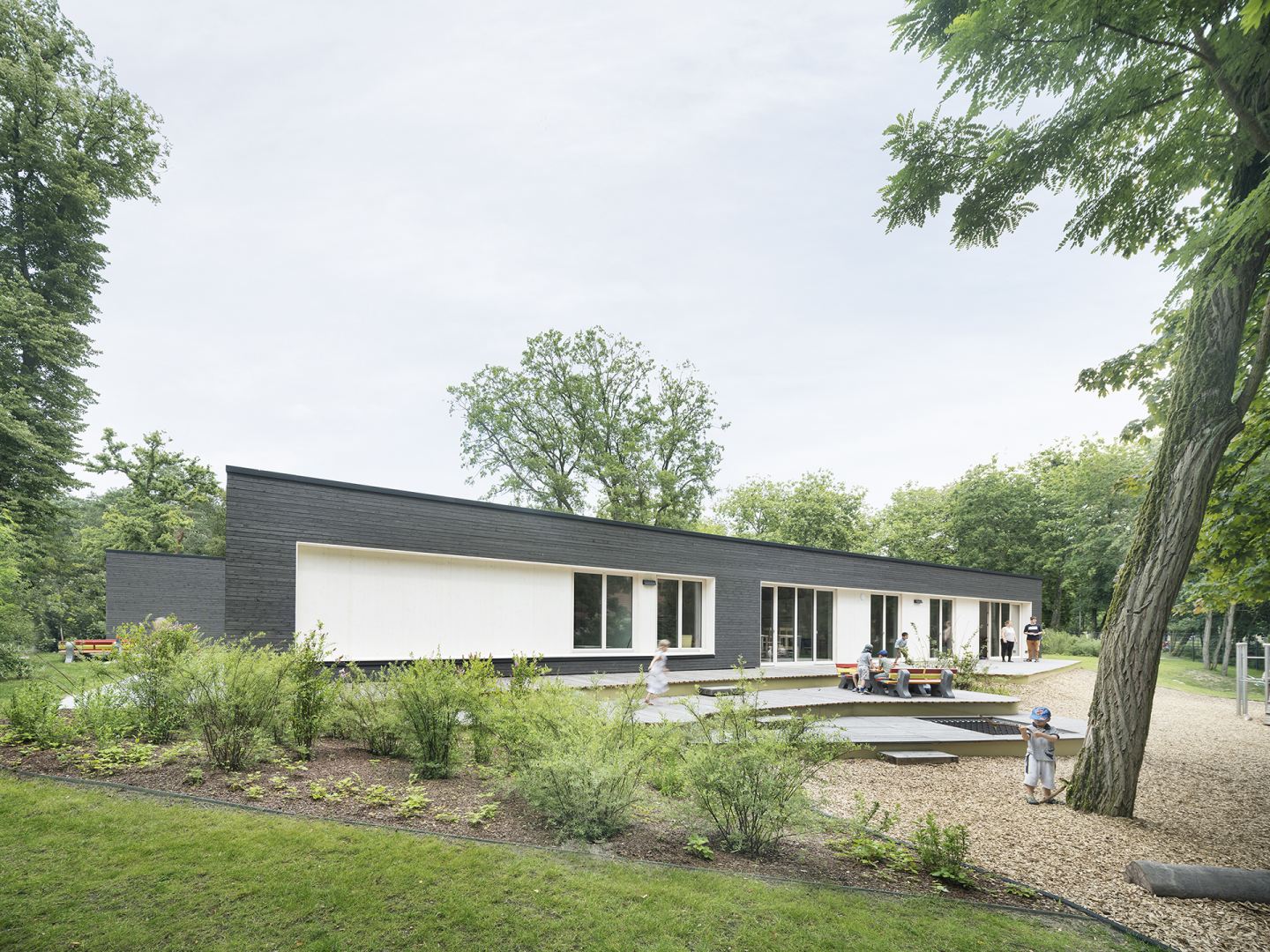 Das von TRU Architekten geplante Gebäude ist als Holzbau konzipiert und auf einer Bodenplatte aus Stahlbeton errichtet. Die Wände bestehen aus Holzrahmenkonstruktionen und sind mit Zellulose gedämmt. Das eingeschossige Gebäude legt sich mit vier Gebäudeflügeln um die bestehende Baumgruppe aus Eichen. Durch die windmühlenartige Anordnung der Baukörper öffnet sich die Gebäudestruktur zu allen vier Himmelsrichtungen und schafft Verbindungen mit dem äußeren Garten. Herzstück der baulichen Konzeption ist die ringartige geschlossene Erschließung aller Funktionsbereiche.