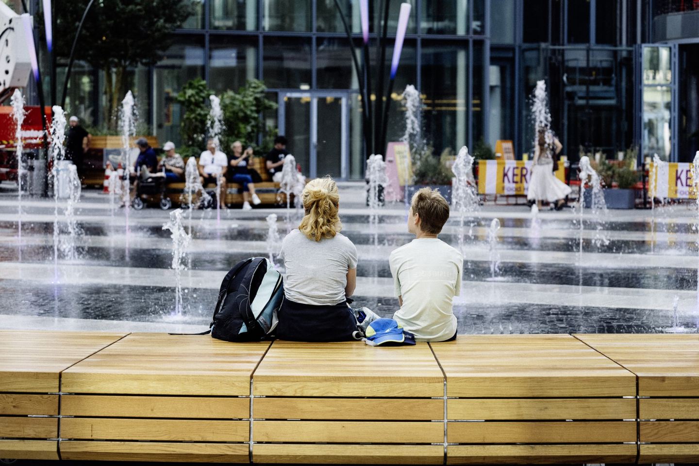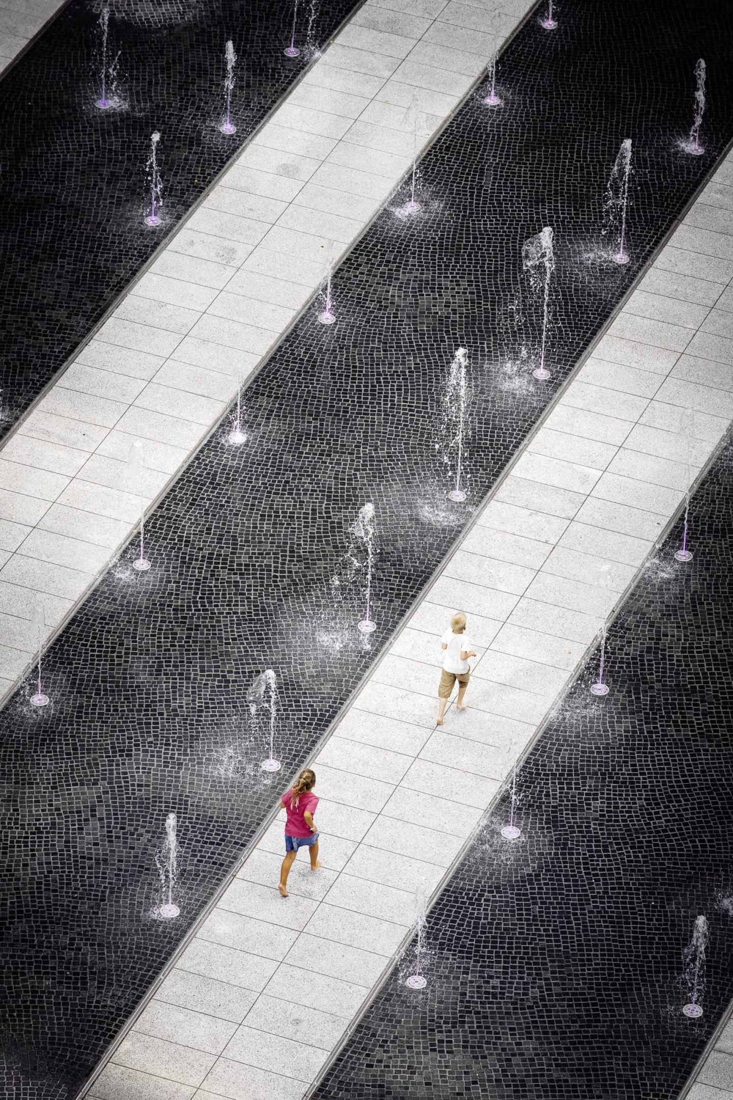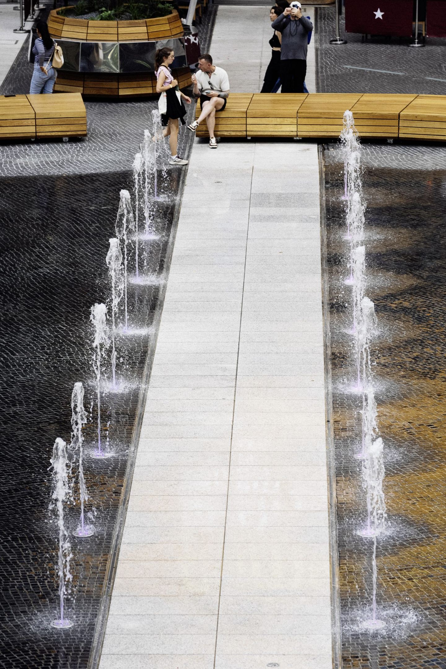 Das ehemalige Wasserbecken wurde durch ein neues begehbares Fontänenfeld ersetzt, das als interaktives Element fungiert. Die Wasserspiele sind bei Bedarf deaktivierbar und bieten einen goßzügigen Raum für Veranstaltungen, Kunstaktionen oder Sport – ein Sinnbild für die Neuausrichtung des Ortes.