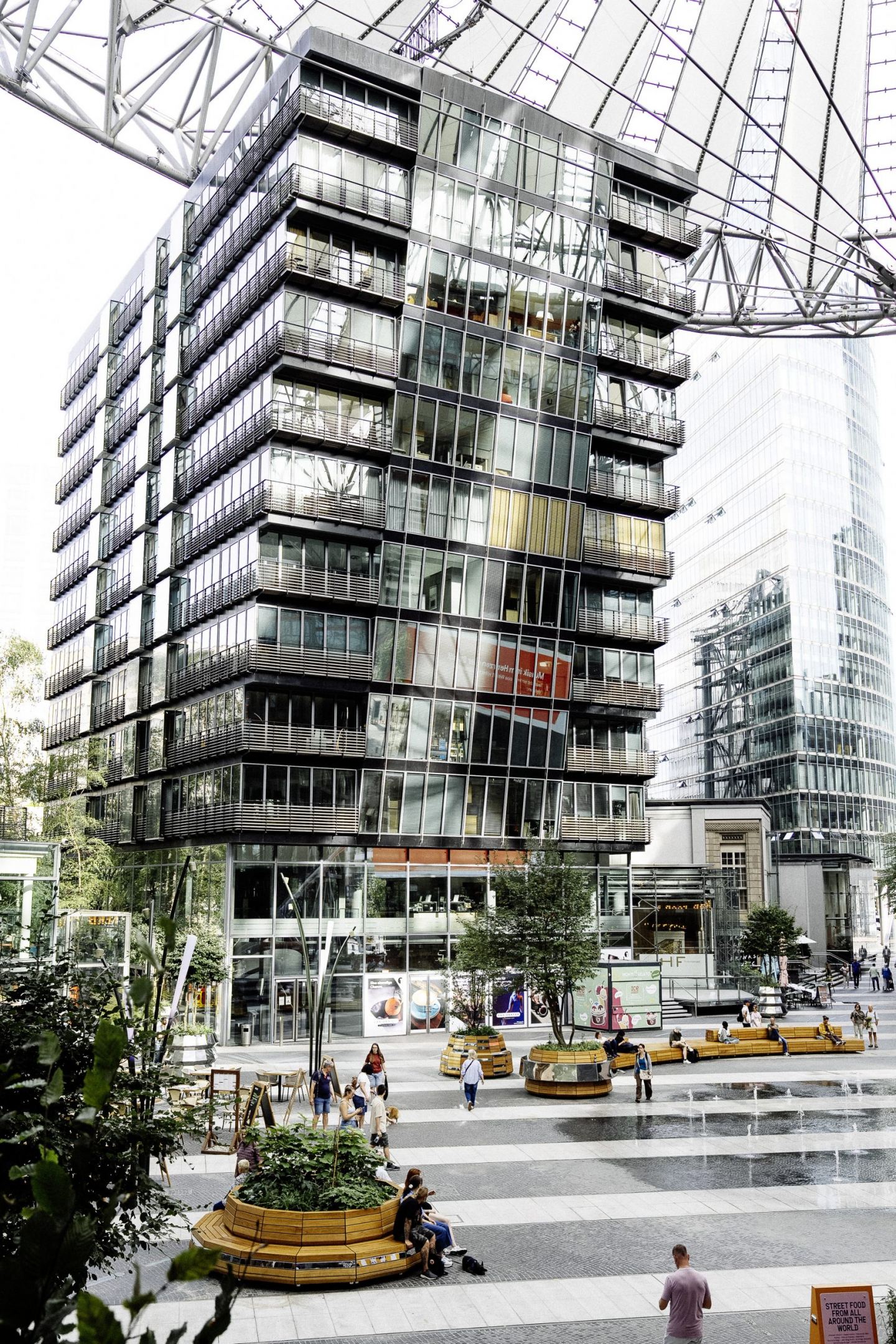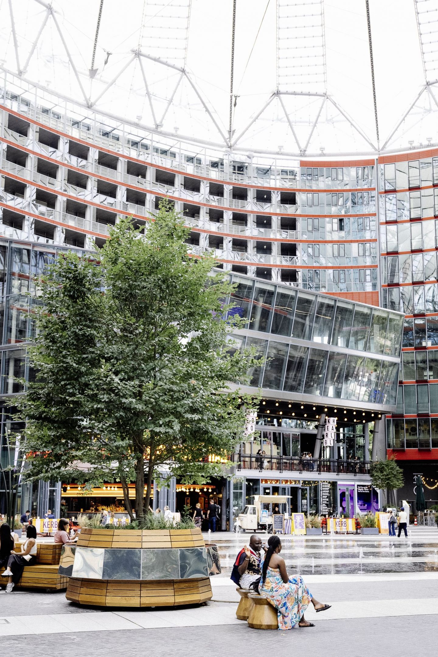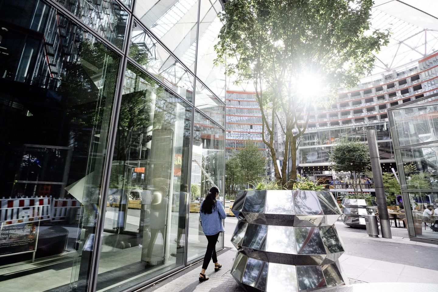 Als städtebauliches Wahrzeichen im Zentrum Berlins präsentiert sich das heutige Center am Potsdamer Platz in neuem Gewand. Durch ein umfassendes Refurbishement ist das Ensemble neu gestaltet worden – mit klarem Fokus auf Aufenthaltsqualität, Nachhaltigkeit und urbane Bewegungs- und Freizeitangebote. Die bis zu 40 Meter hohen Glasfassaden bleiben als ikonische Hülle enthalten. Die Geometrie des Forums bleibt bewahrt, die Inhalte verändern sich: Statt formaler Bepflanzung prägen nun neue Bäume und großformatige Pflanzgefäße das Bild. Sie schaffen eine grüne, einladende Atmosphäre. Die gesamte Ausstattung folgt einem modularen Prinzip: Versiegelte Edelstahl – Pflanzgefäße, bis zu sieben Tonnen schwer, können flexibel verschoben werden, wie auch die großzügigen Holzsitzbänke. Die Verspiegelung reflektiert das Zeltdach des Forums, greift bestehende Gestaltungselemente wie polierten Edelstahl auf und setzt verspielte Akzente. Durch die Mobilität des Inventars wird eine dynamische Nutzung des Raums ermöglicht, angepasst an saisonale, kulturelle oder soziale Bedürnisse. Zahlreiche Bäume, üppige Bepflanzung und einladende Aufenthalts- und Sitzgelegenheiten verschaffen dem Ort, eine wärmere lebendigere Atmosphäre und laden zum Verweilen ein. Die Vegetation und Blatttranspiration hilft bei der Klimaregulation und verschafft Kühlung in wäremeren Jahreszeiten. Die durchdachte Materialwahl – darunter spanisches Granit, heimische Eiche und Naturstein – bewahrt den Charakter des Ortes und modernisiert ihn zugleich. Generell wurde angestrebt weitgehend den CO2 Footprint der angewendeten Materialien umweltbewusst einzusetzen.