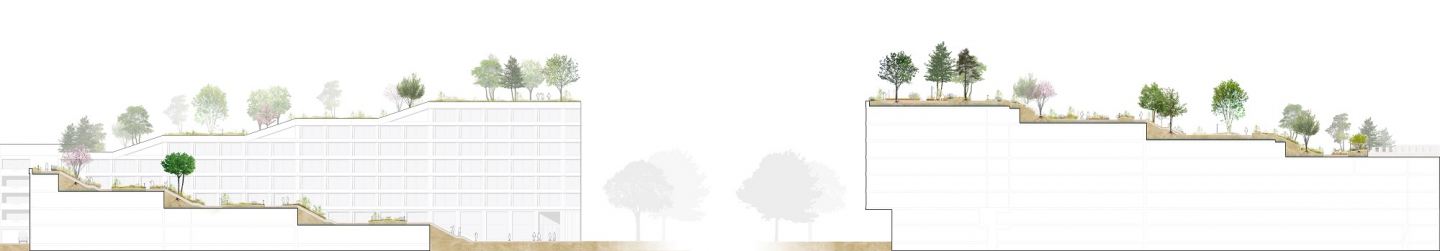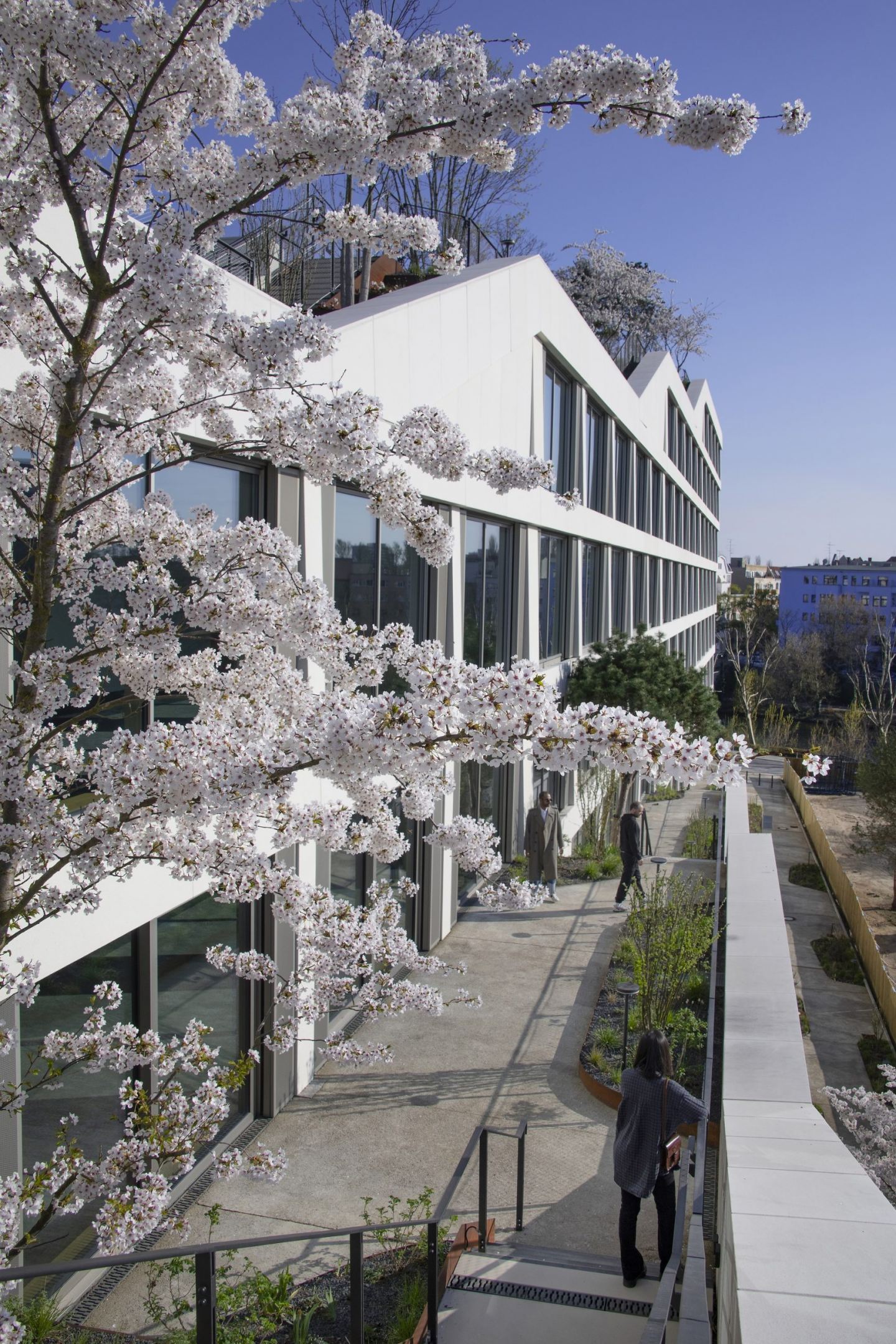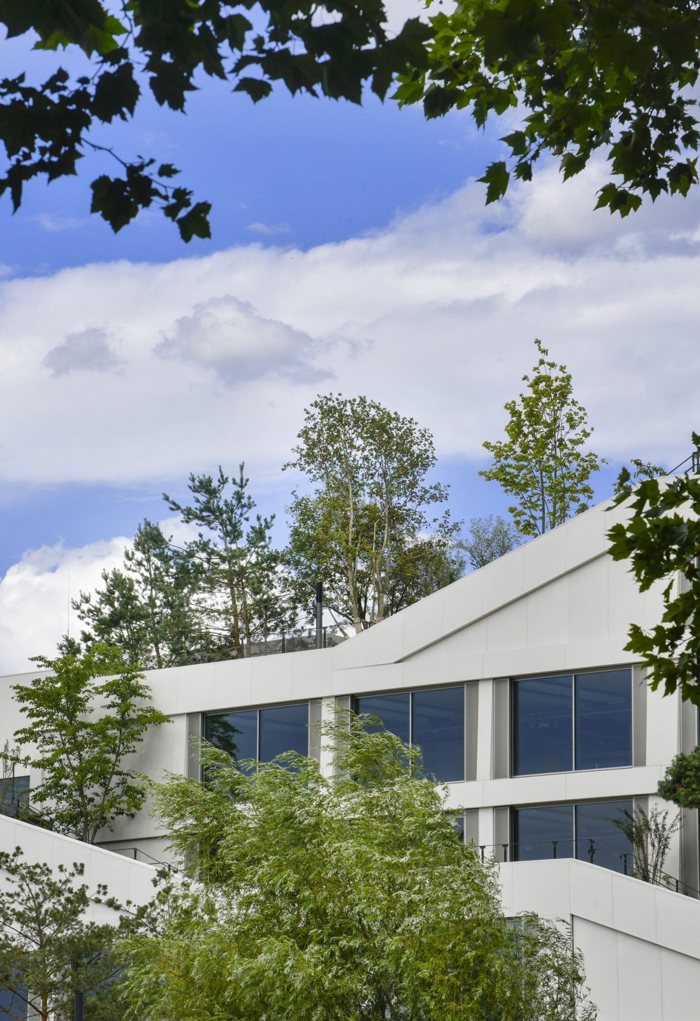 Die kaskadenförmige Staffelung der Geschosse schafft die Basis für eine durchgehende Parklandschaft, die sich über das gesamte Gebäude erstreckt. Nahtlose Wege verbinden das Erdgeschoss mit dem 8. Obergeschoss und schaffen so eine grüne Achse.