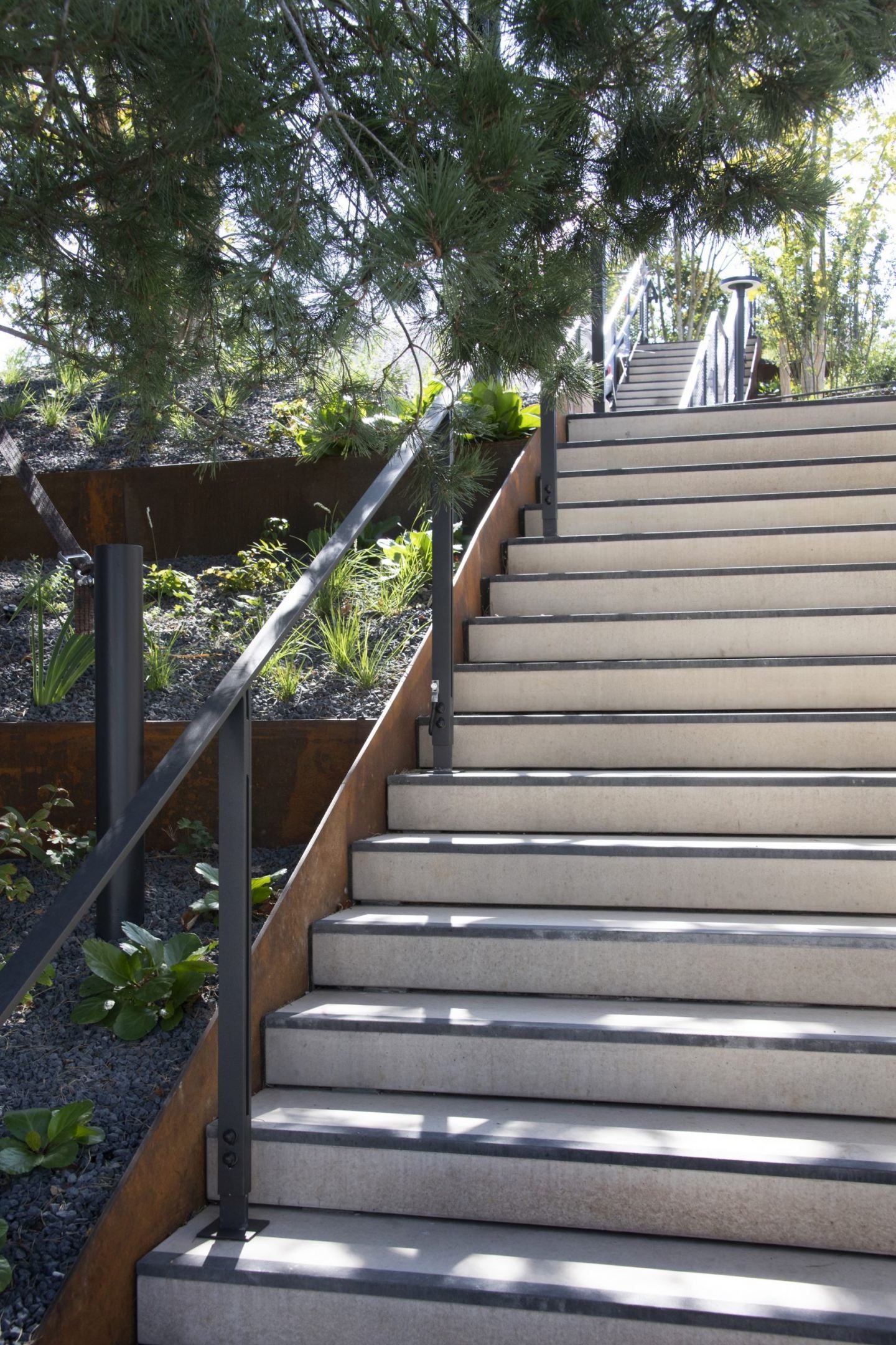 Die mit Mutterboden gefüllten, sanft modellierten Übergänge zwischen den Etagen bilden keine klassischen Terrassen, sondern eine kontinuierliche, gestaltete Parklandschaft – eine Raumerweiterung der angrenzenden Büros, in der unter freiem Himmel gearbeitet werden kann. Schatten, Wind, Luft und Düfte bereichern den Arbeitsalltag.