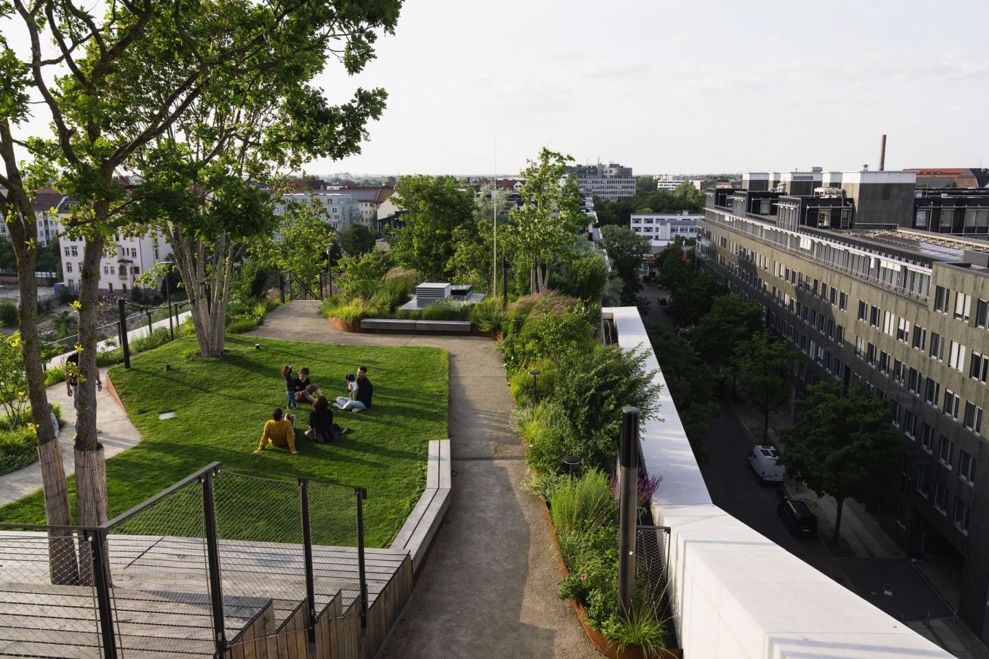 Die Mierendorffinsel soll sich zu einem innovativen Archipel und einem grünen Manifest einer anderen Art von Stadt entwickeln. Das Gebäude überzeugt durch eine neue Vorstellung von Urbanität: offene Großraumbüros, die durch 2.200 m² begrünte Dachflächen miteinander verbunden sind.