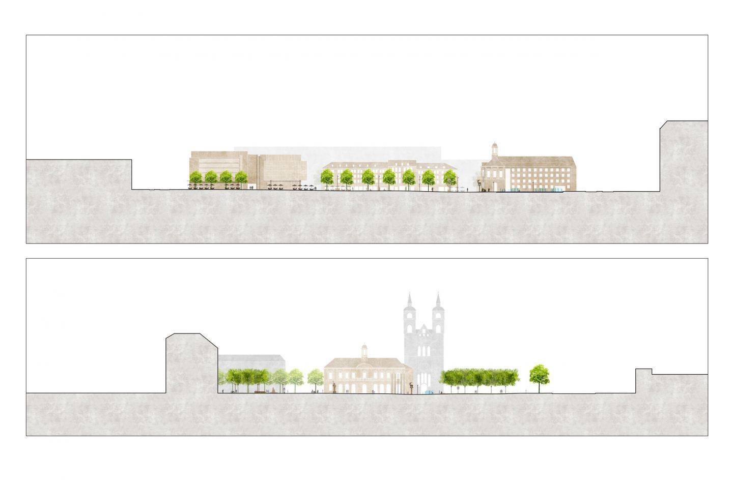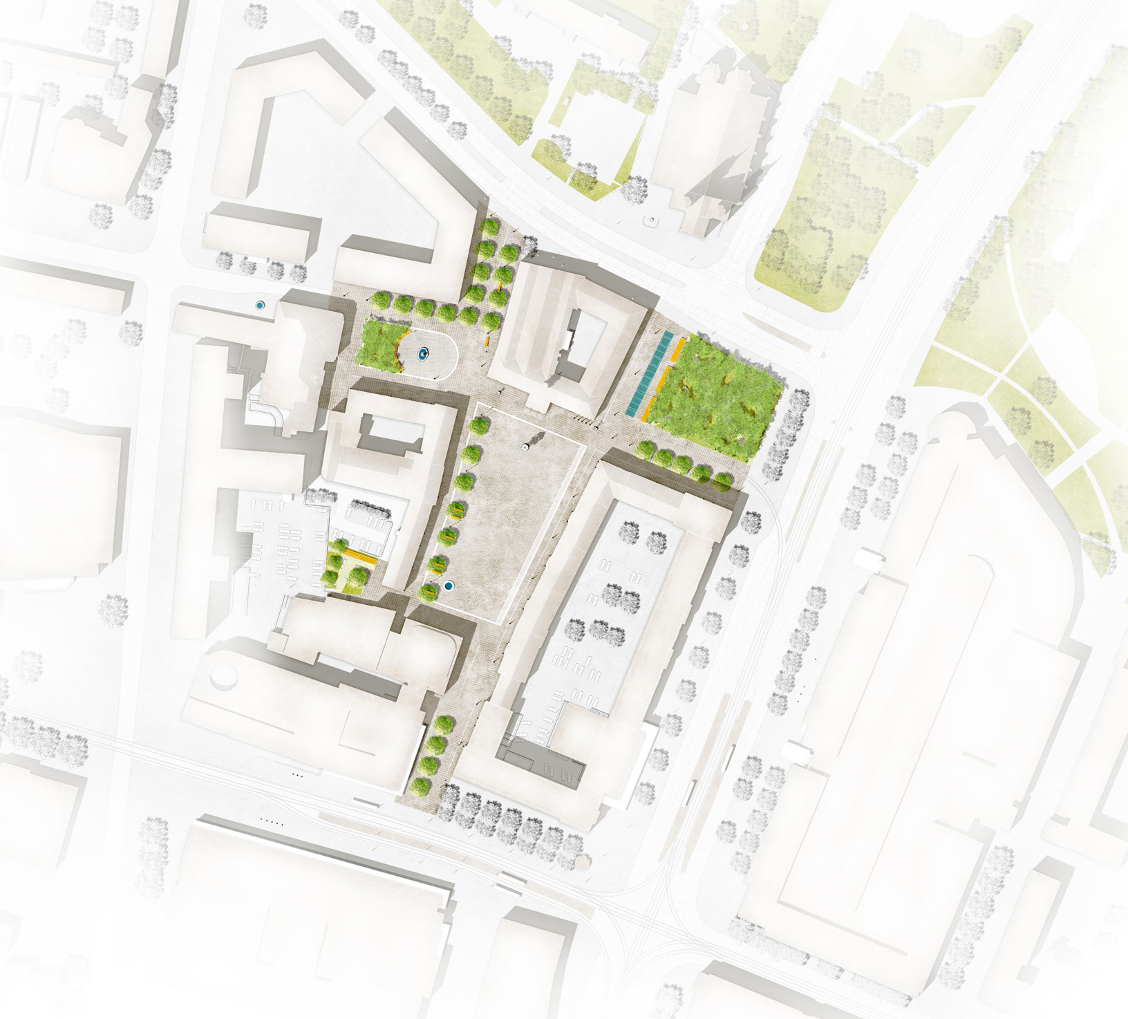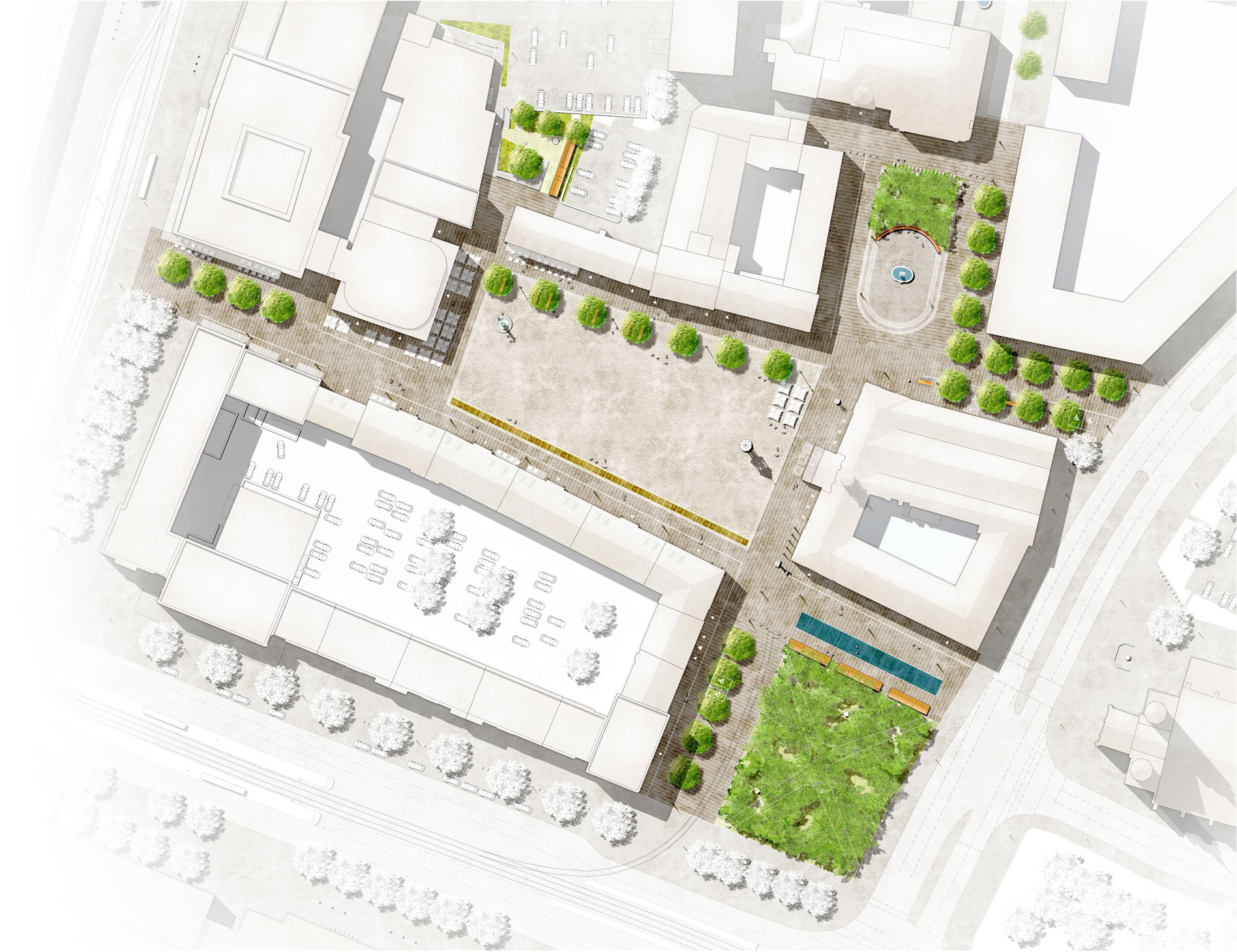 Die Auswahl und Gestaltung des Stadtbodens ist neben den Gebäuden das wichtigste Element einer Stadtsanierung. Ein als „Stadtparkett“ konzipierter Flechtverband aus Granitpflaster hebt die Mittelzone des Alten Markts hervor und unterstreicht damit die besondere Bedeutung und Wertigkeit des Stadtraums. Der Belag zoniert das öffentliche Leben, trägt den Verkehr, weist die Richtungen.