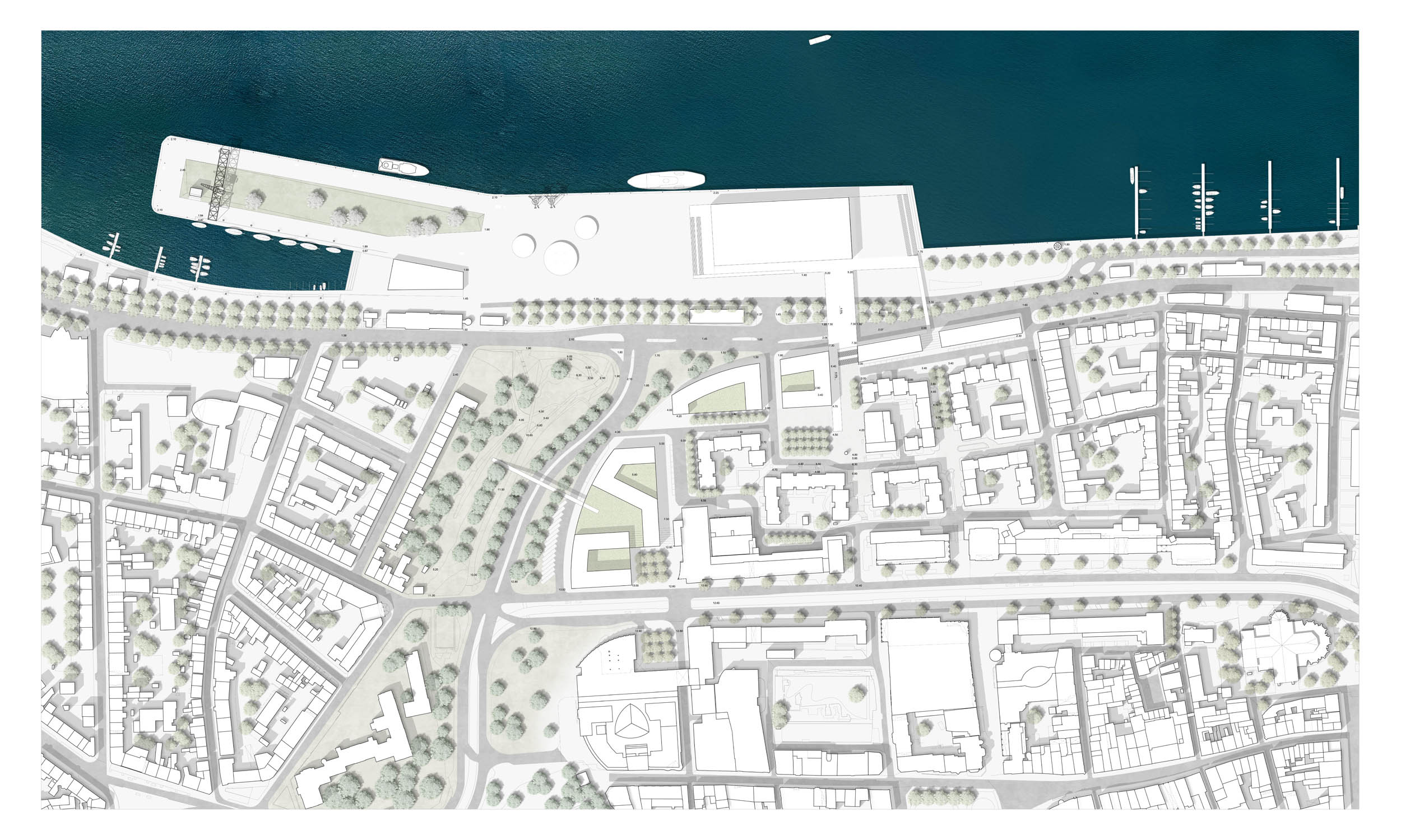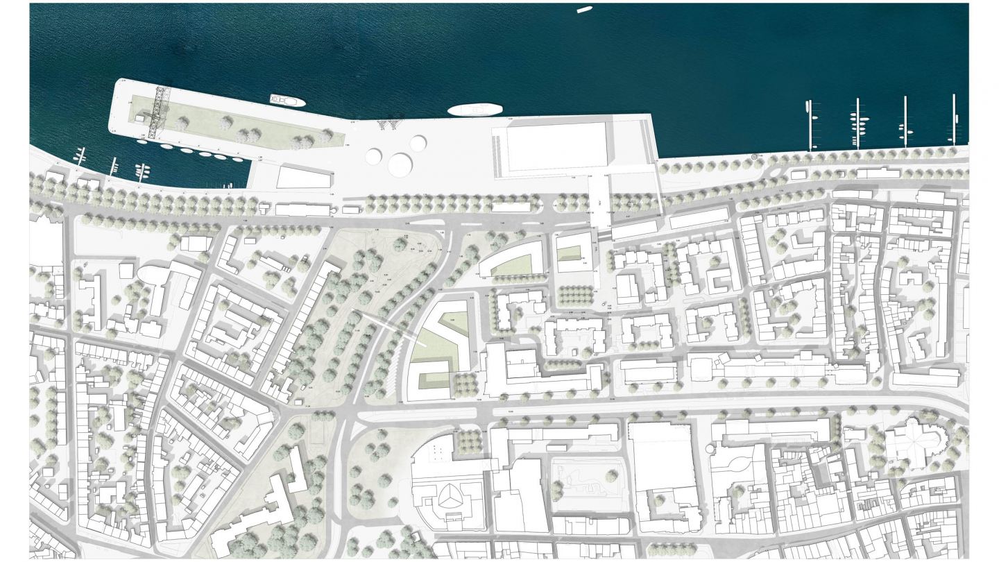 Der wichtigste Regler zur Justierung des künftigen Stadtbildes ist die Verortung des gewünschten Vier-Spaten-Theaters am Wasser. Es fungiert an diesem Standort wie ein Anker für die Stadt. Gleichzeitig wird angestrebt, das Bussebartareal mittels einer behutsamen aus dem bestehenden Stadtgrundriss entwickelten Arrondierung der Stadtkante, zu gestalten. Die Arrondierung ermöglicht eine (Wieder-) Etablierung einer neuen räumlichen Klarheit, Körnigkeit und eines Gleichgewichts für die nördliche Altstadt. Diese Stadtreparatur vervollständigt das bereits begonnene gestalterische Sichtbarmachen der historischen Stadtgrenze am Kanonsberg.