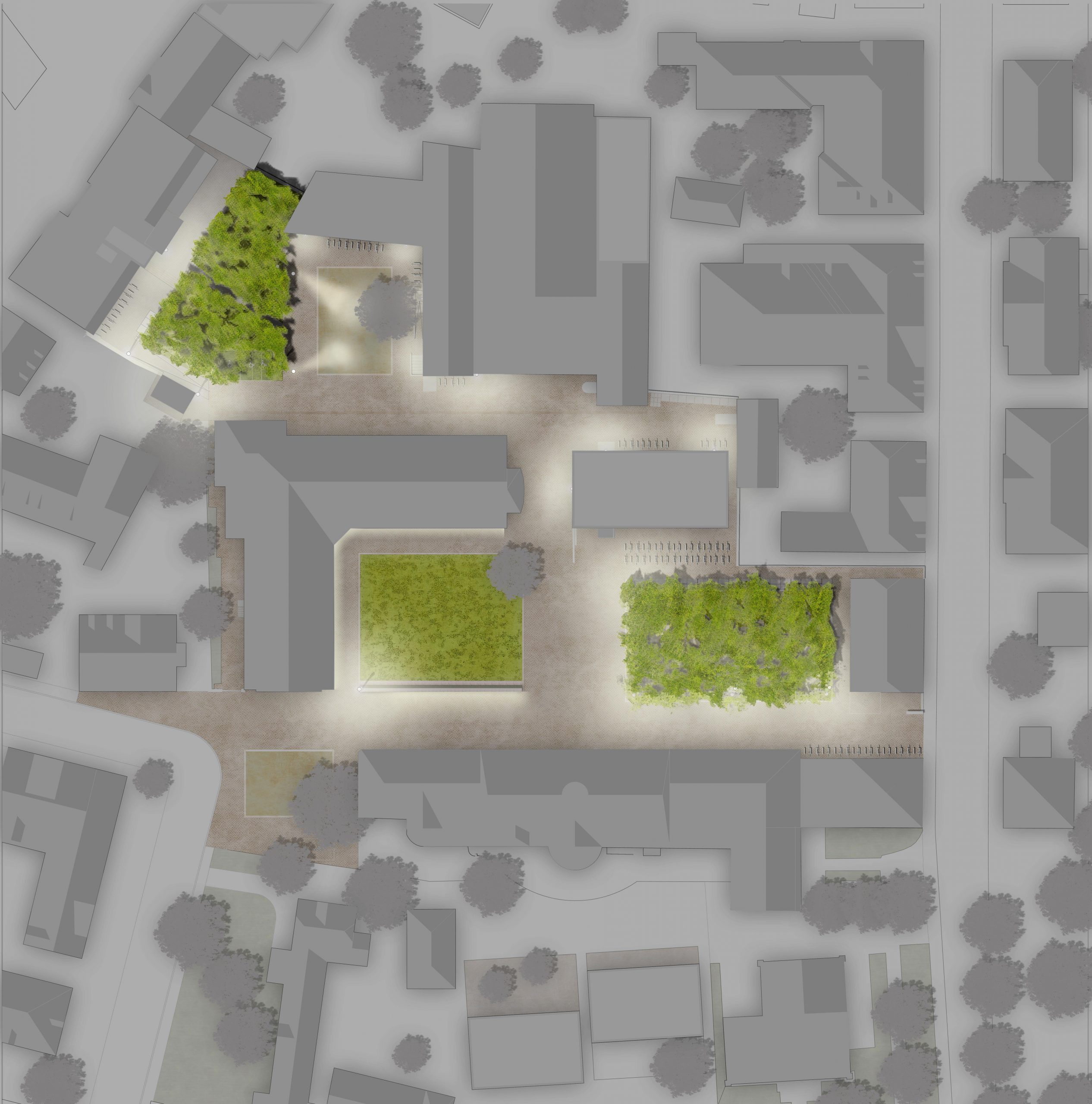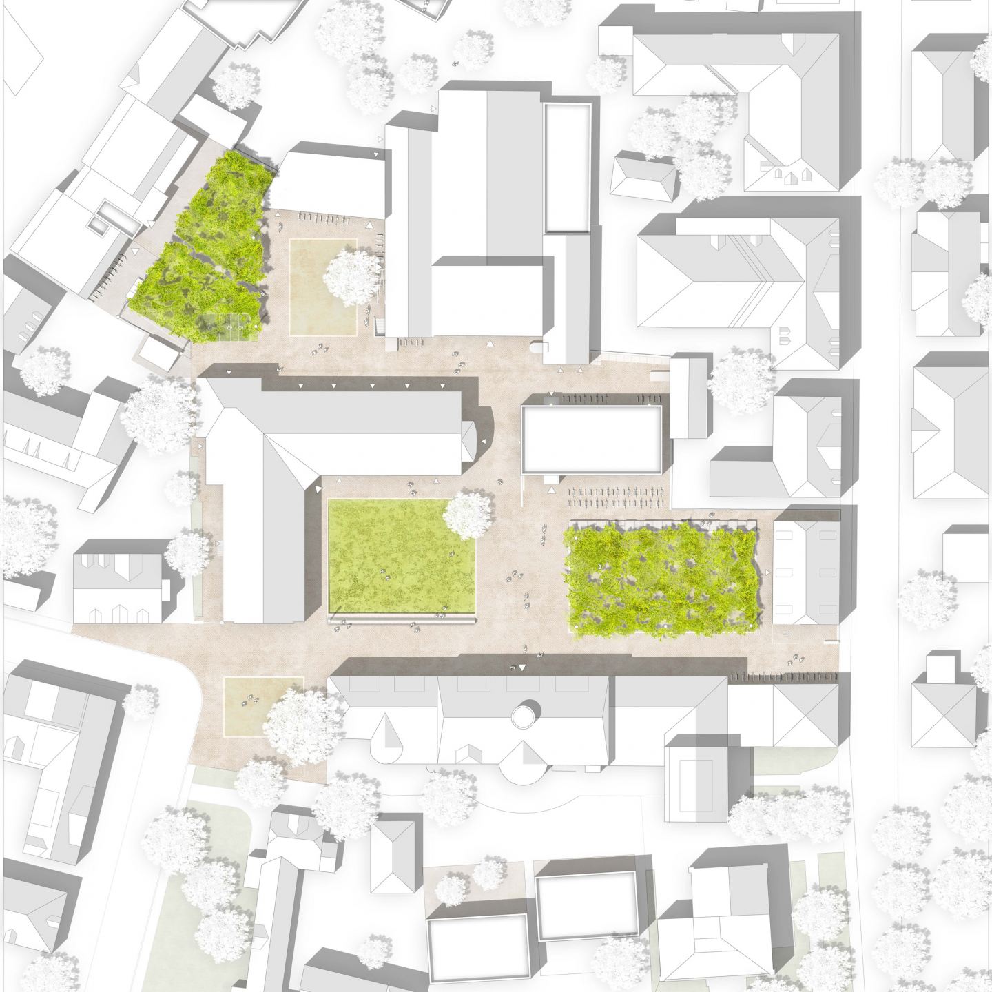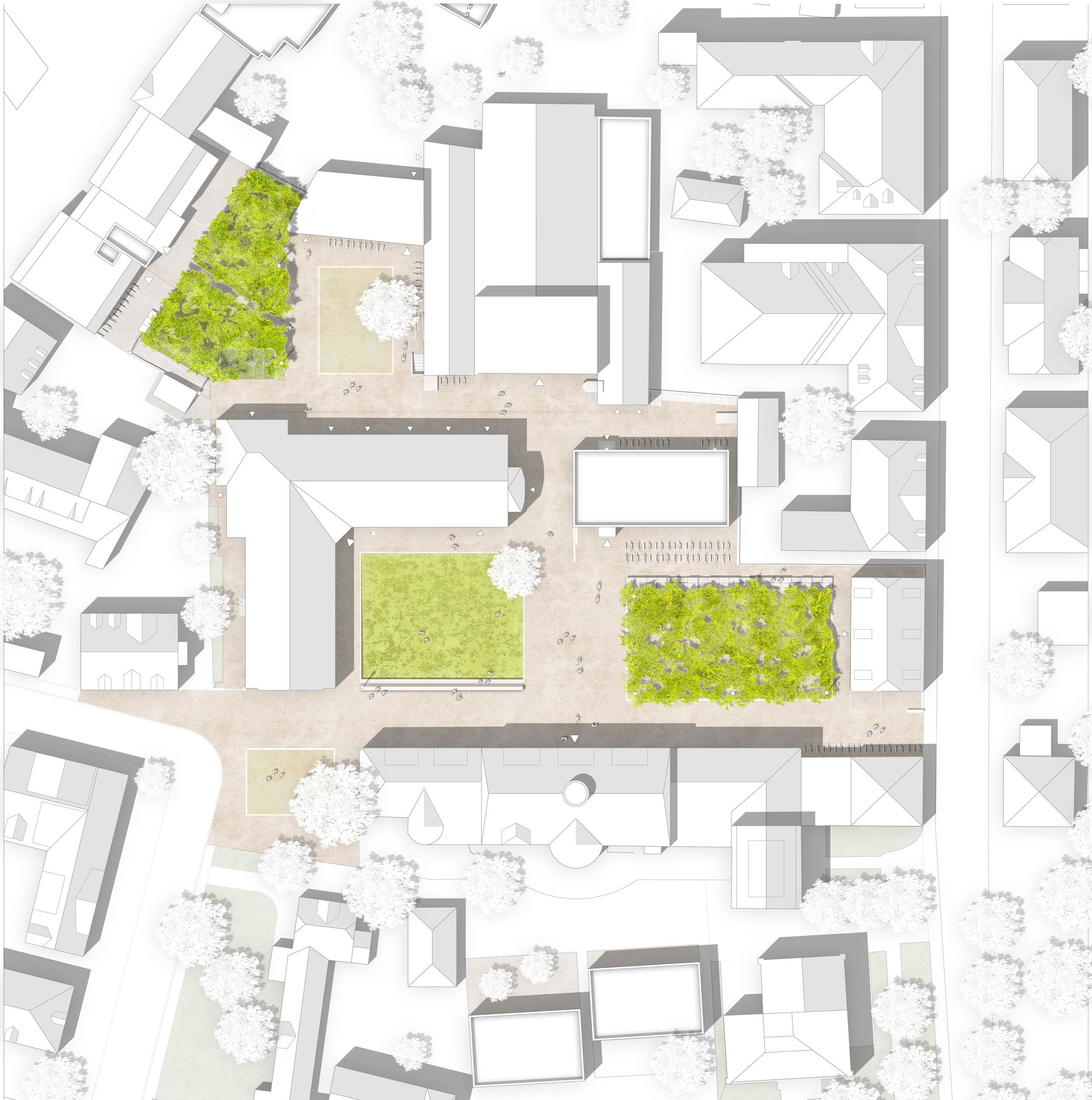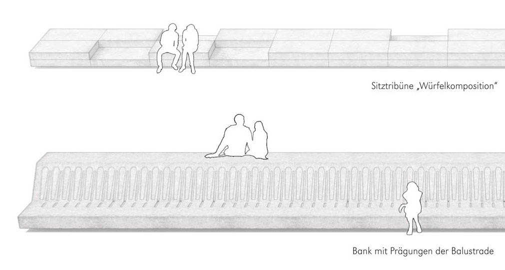 In der Tradition der Bauhausbühne werden die existierenden Raumfragmente in atmosphärische und raumwirksame „Freiluft-Theater“ verwandelt. Die Gestaltung lässt die Kunstschule und die Kunstgewerbeschule gebührend zur Geltung kommen. Das Ergebnis ist eine Abfolge von getrennten, klar lesbaren – durch das simultane Miteinander – vielschichtigen Landschaftsräumen, die Moderne und Vergangenheit zugleich verkörpern. Diese Räume, die sogenannten „Bühnen“, resultieren aus Bedeutungen, Interpretationen und Erfahrungen und schöpfen aus dem Potential des Ortes.