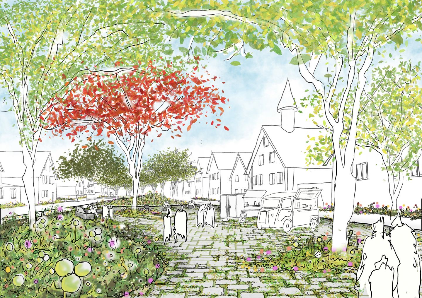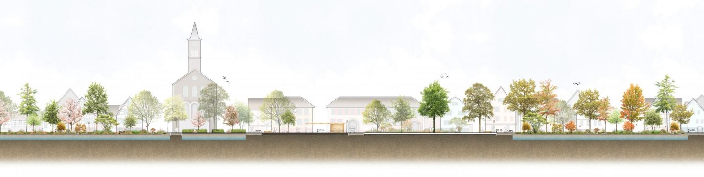 Der Anger wird als klimawirksamer, barrierefreier und sozial nutzbarer Freiraum gestaltet – mit Aufenthaltsqualität für alle Generationen. Maßnahmen zur Verschattung, Entwässerung und Durchlüftung verbessern das Mikroklima. Nachhaltige Materialien und ortstypische Bepflanzung sichern ökologische und gestalterische Qualität.