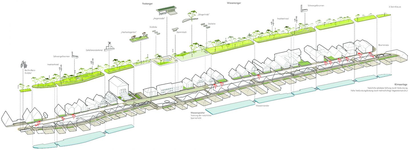 Der Anger gliedert sich in drei Bereiche mit zunehmender Offenheit: Schlossanger im Westen – gartenhaft, ruhig, mit Denkmal und Spielpunkten. Festanger als Zentrum – mit Hochzeitsgarten, autofreiem Dorfplatz samt „Blütendiwan“, Wasserlinse und multifunktionalem Anger-Stadel sowie dem Lindenhof als temporärer Nebenplatz. Wiesenanger im Osten – naturnah, extensiv begrünt, mit Regenrückhalt und landschaftlichem Übergang.
