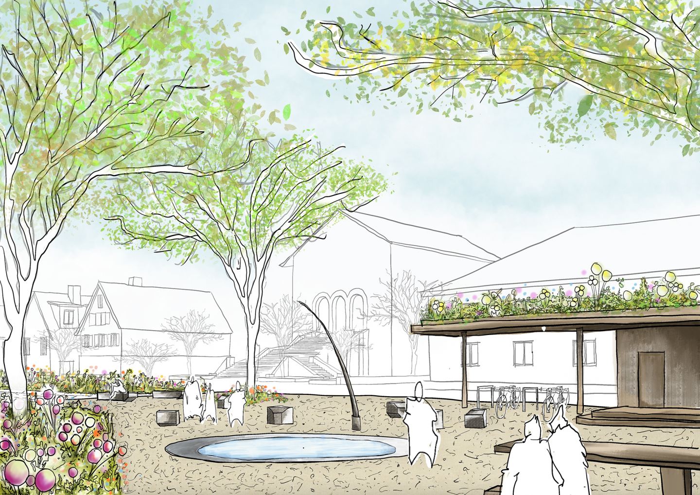 Ein naturnahes Regenwasserkonzept mit Retentionsflächen, Feuchtstauden und wasserdurchlässigen Belägen schafft Kühlung, verbessert Luftqualität und setzt das Schwammstadtprinzip um – dezent, aber wirksam.