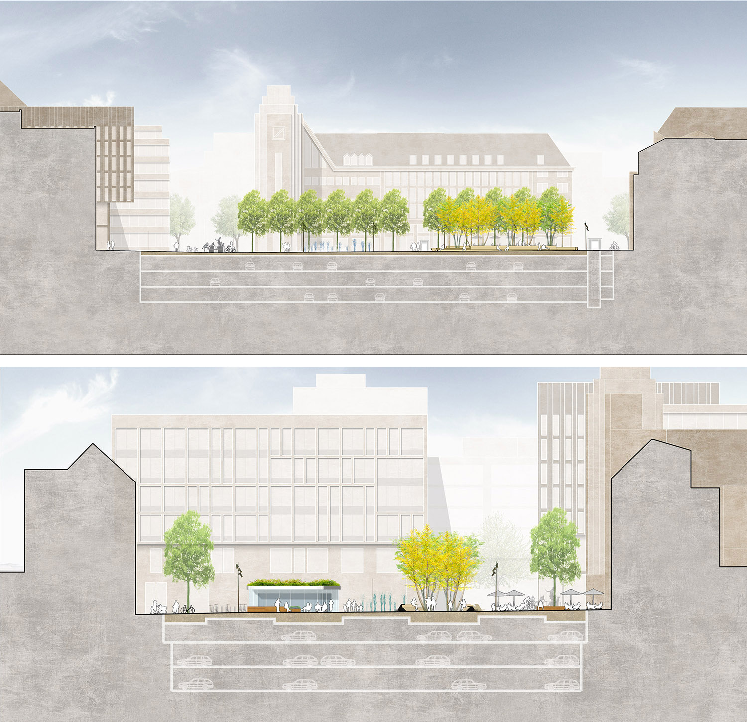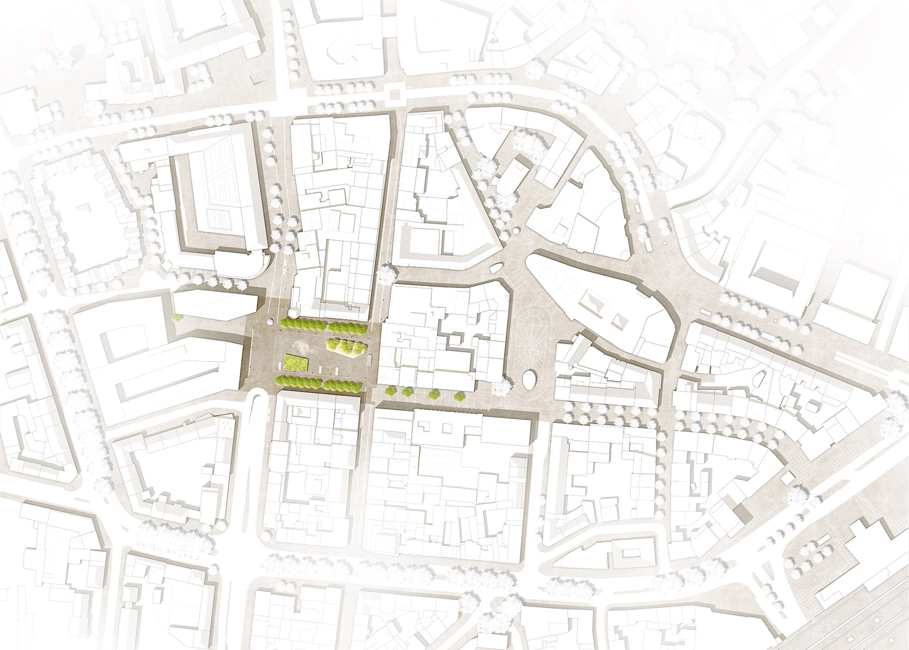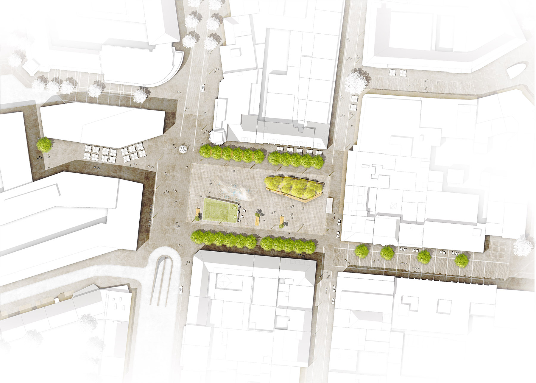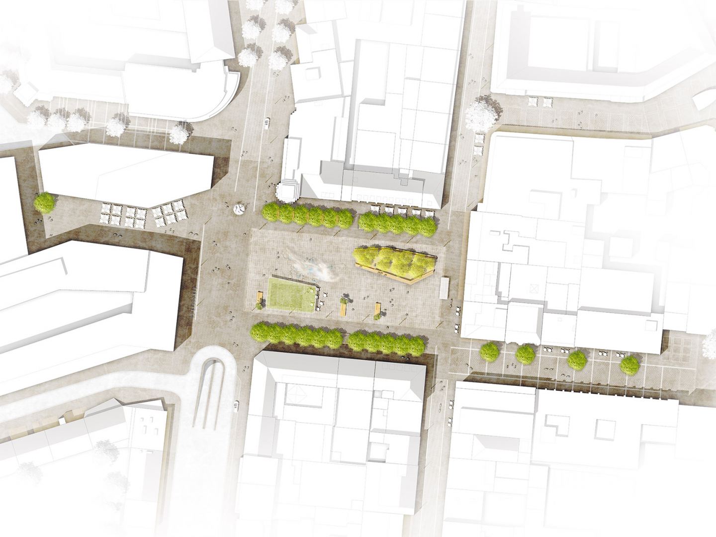 Ziel des vorgeschlagenen Gestaltungskonzeptes ist die Neubestimmung der prominenten innerstädtischen Situation im Kontext zeithistorischer Überformungen und nachhaltiger Gestaltung, einerseits die Zugänglichkeit und den multifunktionalen Charakter als nutzungsoffene, lebendige Markt- und Veranstaltungsfläche herauszuarbeiten; andererseits Verweil- und Aufenthaltsbereiche mit einem auf den Ort abgestimmten Vegetationsbesatz sowie Sitz- und Wasserspielelementen signethaft zu akzentuieren und seine Funktion als verbindender Stadtraum zu stärken.