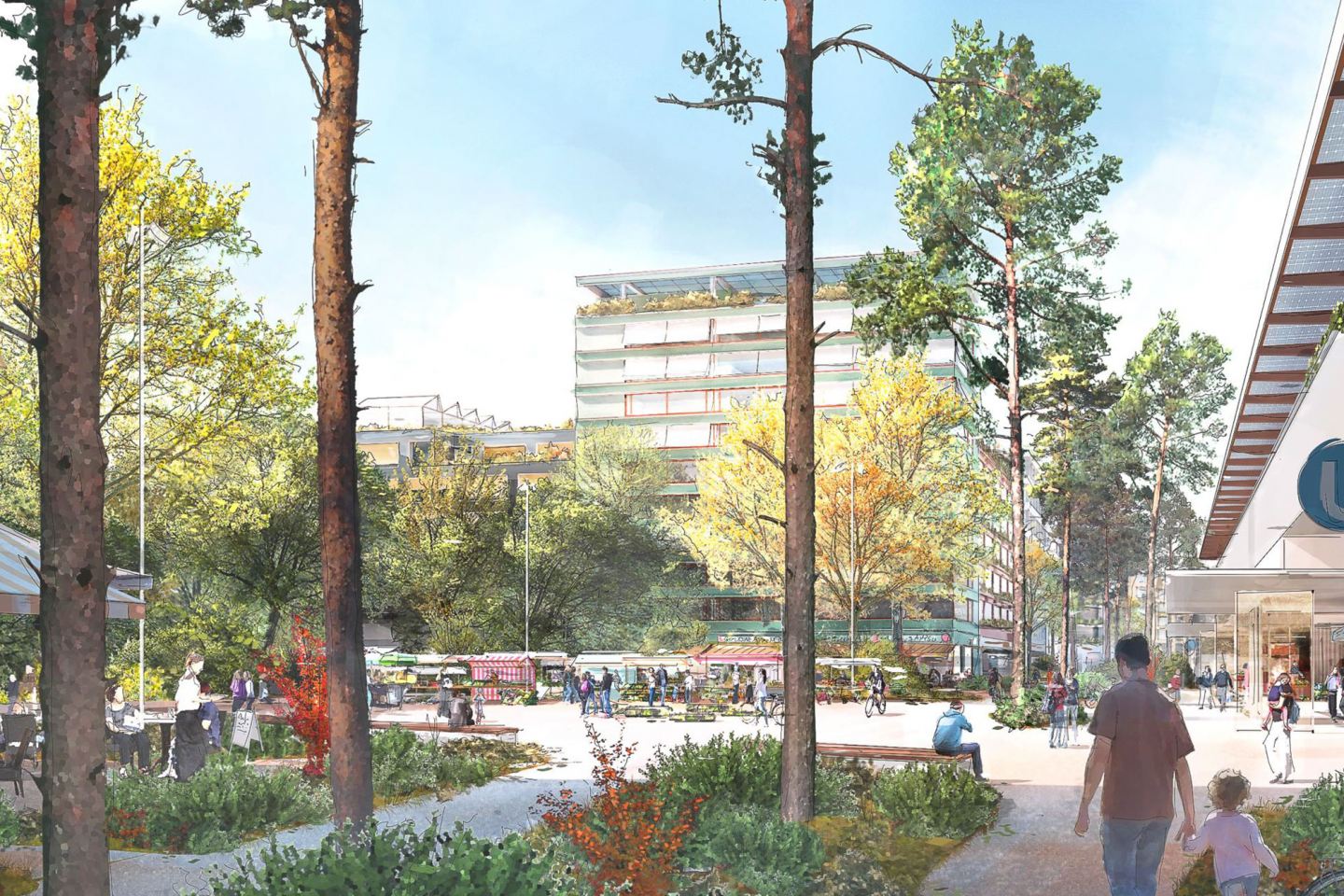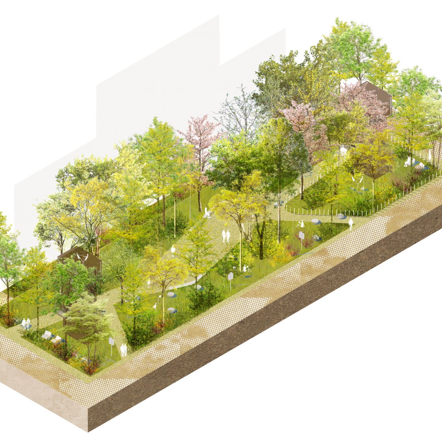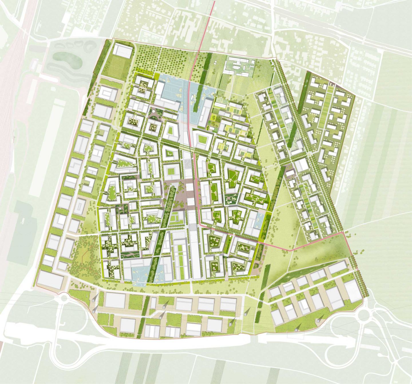 Am Rand der Bearbeitungsgrenze befindet sich ein Saum von 28 Hektar Industrieflächen (nach Westen und Süden) und von 12 Hektar Allmende (nach Osten) mit gemeinschaftlichem Charakter für Streuobstwiesen als Marmeladengärten, Steinpilz-Wälder sowie Feldparkanlagen. Zwischen diesen beiden bebauten Schichten ist ein ringförmiger 31,5 Hektar großer Stadtteilpark geplant, der von überall innerhalb von maximal 5 Minuten erreichbar ist. Dieser zirkuläre Park versteht sich primär als wichtiges, übergeordnetes Bindeglied – als Verbund – zwischen den angrenzenden landwirtschaftlichen Feldern und den bestehenden Quartieren. Er ist gleichzeitig eine ökologische Schneise und eine aufeinander abgestimmte Abfolge von unterschiedlichen Freiraumcharakteren.