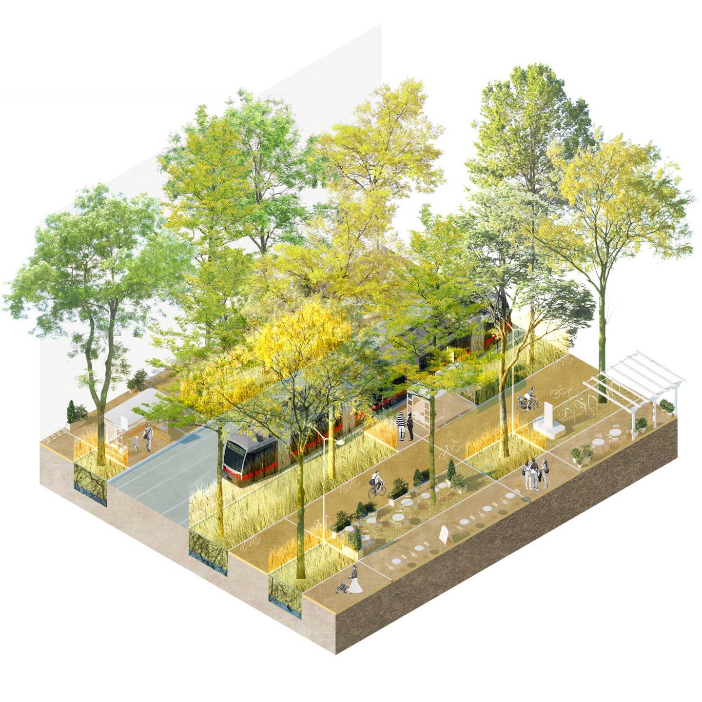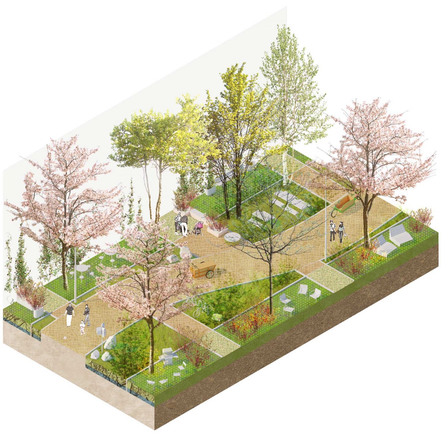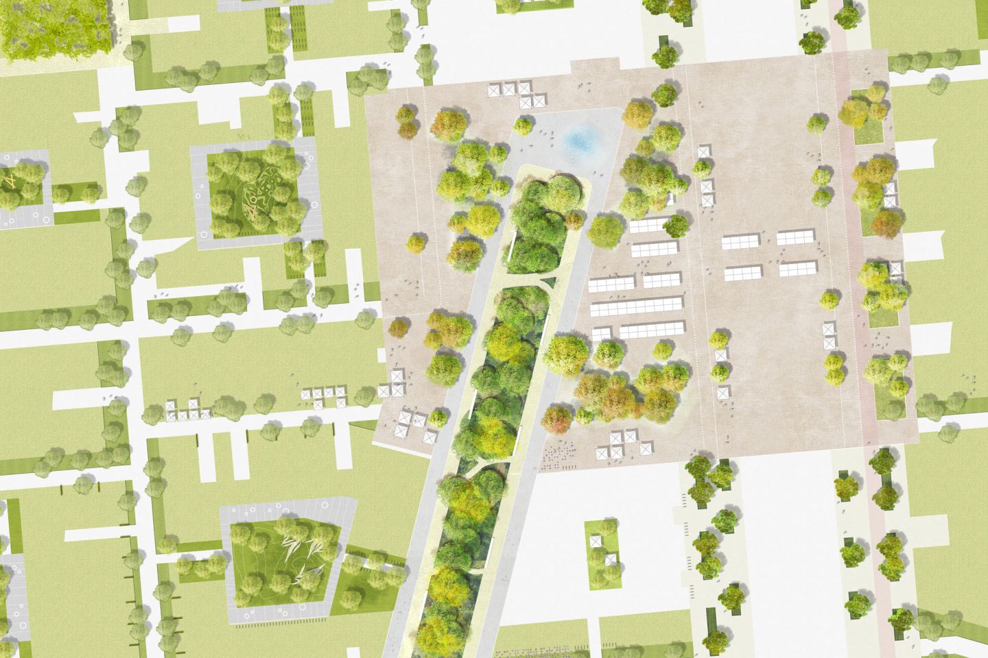 Mit der Entstehung eines neuen Stadtteils stellt sich die Frage nach der Massenverteilung, der Dichte und der Weite. Unsere Planung sieht einen kompakten, grünen, sozialen, dichten, urbanen Kern vor bestehend aus 14 Hektar weitläufigen, nachbarschaftlichen, halböffentlichen Höfen, die von unterschiedlichen Schwerpunkten und Themen geprägt sind, sowie 7 Hektar Gemeinschaftsstraßen mit hohem Grünanteil und sehr geringem Versiegelungsgrad, und auf 3,5 Hektar acht Quartiersplätze als übergeordnete Freizeittreffpunkte. Der zentrale Stadtplatz entlang der neuen U-Bahntrasse bildet das Herzstück von Rothneusiedl und ist ein lebendiger Treffpunkt für Märkte, Veranstaltungen und Kommunikation. Durch die Integration der bestehenden Windschutzgürtel ergeben sich eine Vielzahl von Unterplätzen, die sich situativ an heterogene Herausforderungen widmen können.