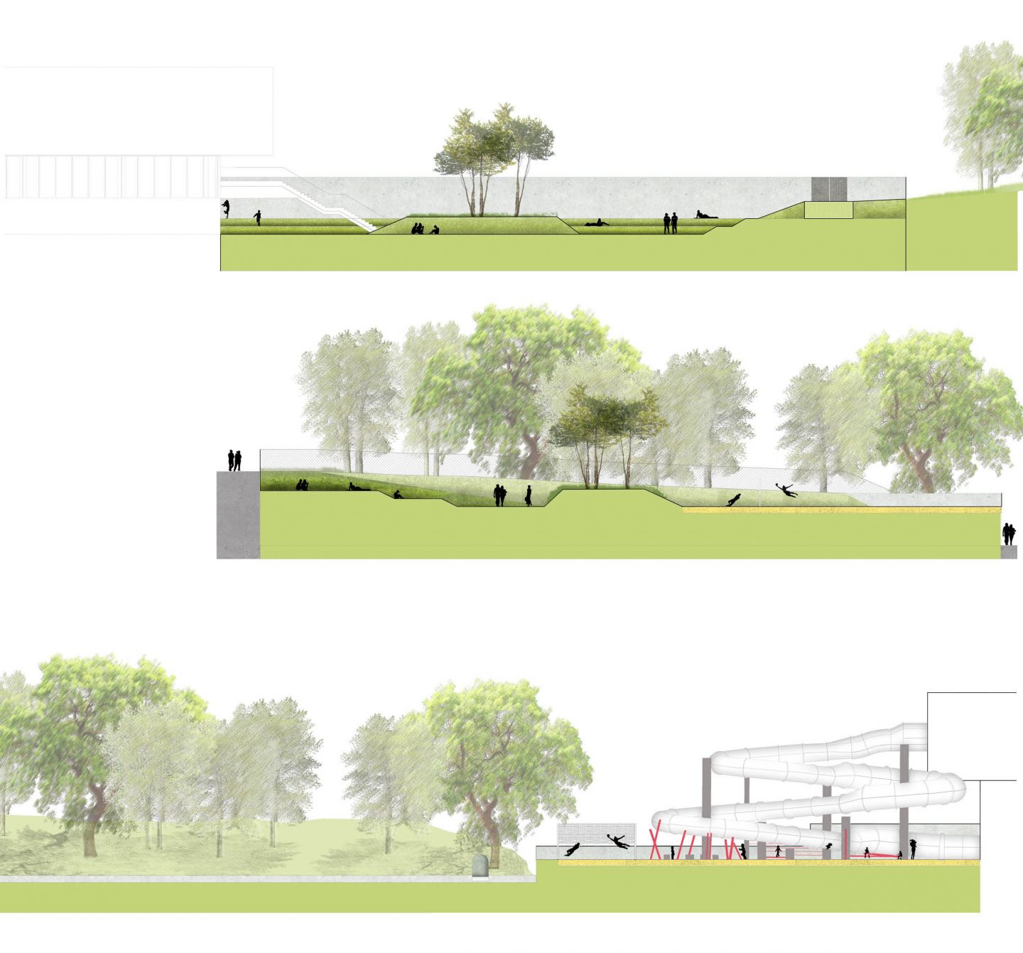 Der Außenraum definiert sich in die drei Bereiche Vorplatz und Park im Osten und Liegewiese im Westen. Mit der Setzung des kompakten Bauvolumens bis an die östliche Bau-Linie bleibt im Westen eine vor dem Straßenverkehr des lebhaften Leipziger Dreiecks geschützte Außenfläche frei: Als Liegewiese ist sie der nach Westen ausgerichteten Badelandschaft zugeordnet und profitiert so von der Nachmittags- und Abendsonne.