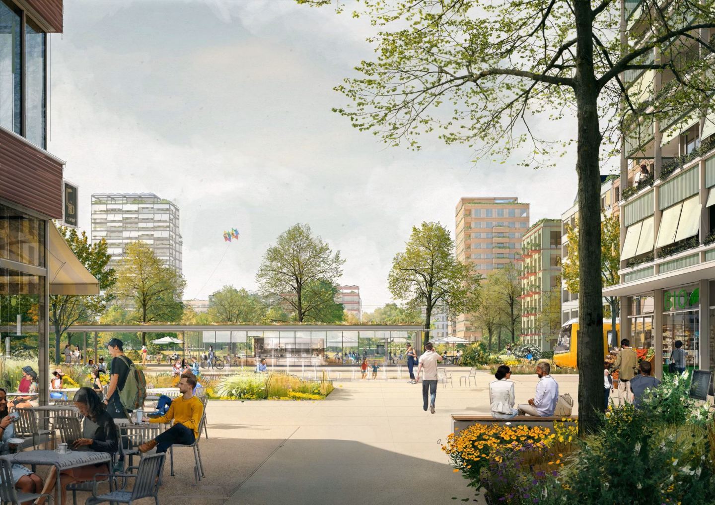 Die neue zentralen Grünflächen funktionieren wie eine natürliche Aue: Regen- und Oberflächenwasser wird aufgenommen, gespeichert und versickert kontrolliert. Retentionsflächen, Tiefbeete, grüne Dächer und sichtbare Wassertanks bilden ein intelligentes Wassermanagement – für ein spürbar besseres Mikroklima.