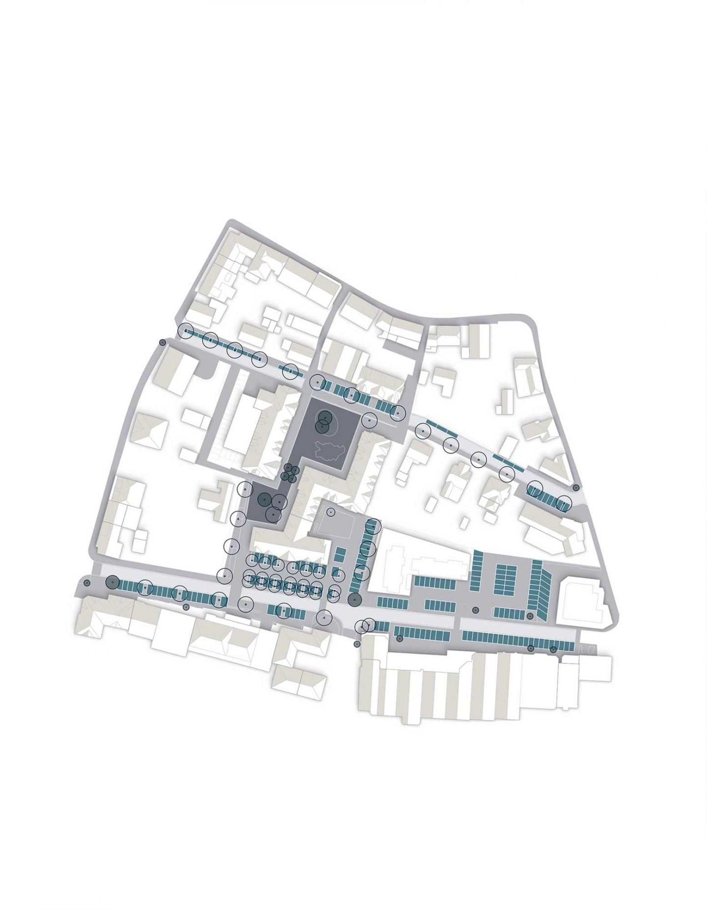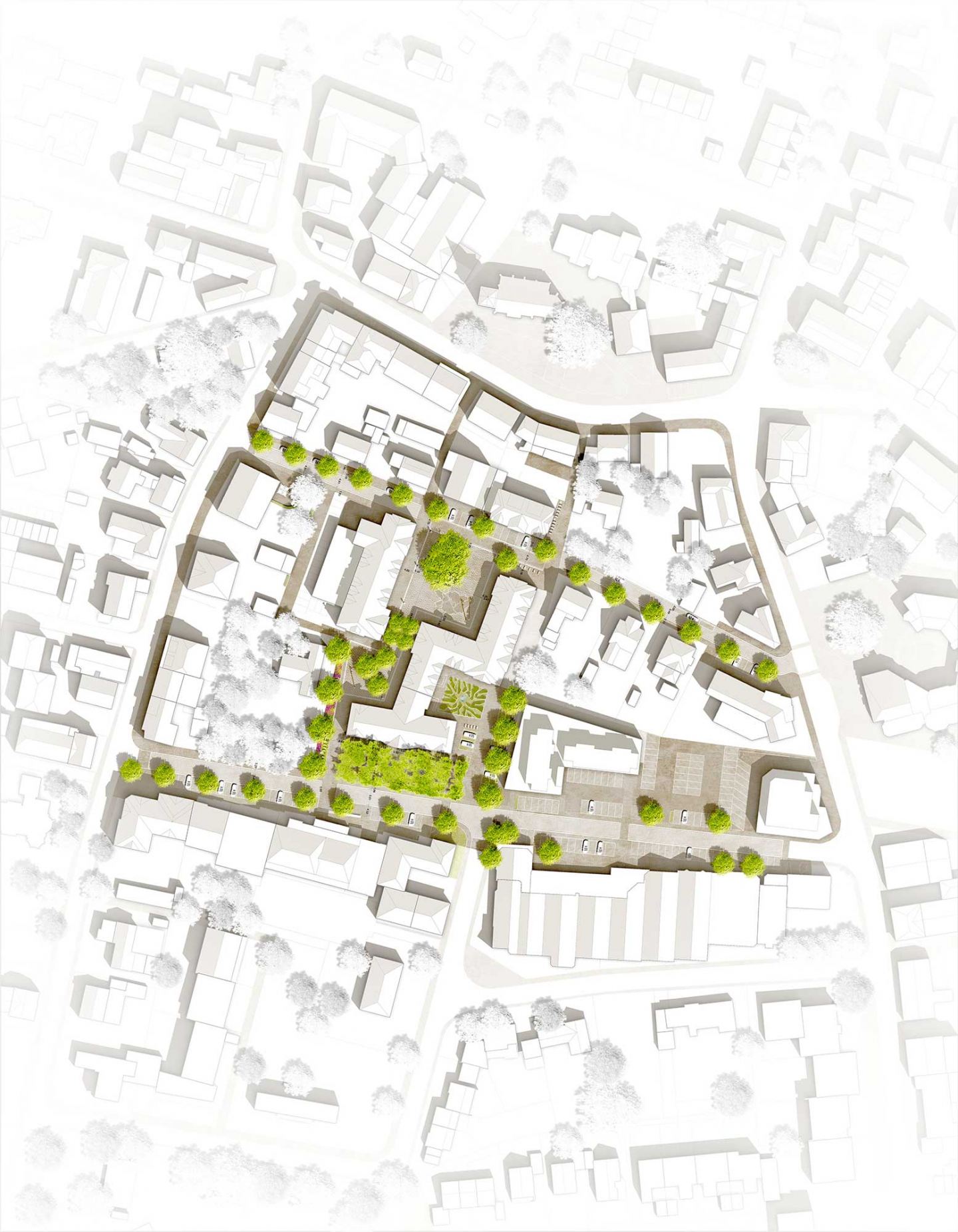 Durch Umnutzung eines ehemaligen Molkereistandortes ist im Zentrum von Hamminkeln in den 80er Jahren ein zentraler Geschäfts- und Gastronomiestandort entstanden, der in den 90er Jahren durch ein weiteres Gebäude ergänzt und bis zur Raiffeisenstraße komplettiert wurde. Der Molkereiplatz stellt seitdem das »Herz« des Ortskerns dar und dient im Ortsmittelpunkt als zentraler Aufenthaltsort. Damit der Platz dieser Bedeutung wieder gerecht werden kann, schlagen wir ein Gesamtkonzept zur Aufwertung des öffentlichen Raumes vor, dass insbesondere auch den Verkehrs- und Erschließungsflächen eine neue Qualität beimisst. Ziel ist es, einerseits die unterschiedliche Bedeutung der verschiedenen Raumprofile herauszuarbeiten; andererseits den Charakter der stadträumlich verschieden geprägten Situationen mit auf den Ort abgestimmten Gestaltungs- und Vegetationselementen als Verweil- und Aufenthaltsbereiche zu stärken.