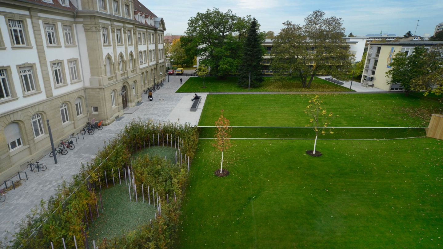 Die Außenraumgestaltung eines Teilbereiches des Karlsruher Institut für Technologie (KIT) erfordert in hohem Maße den sensiblen Umgang mit denkmalgeschützten Gebäuden, Gebäuden aus den 1950‘er Jahren sowie dem modernen Neubau des KinderUniversums, einer Kindertagesstätte mit integriertem Kinderhotel.