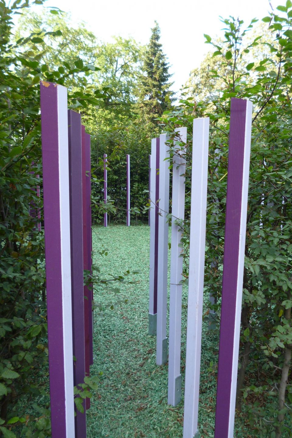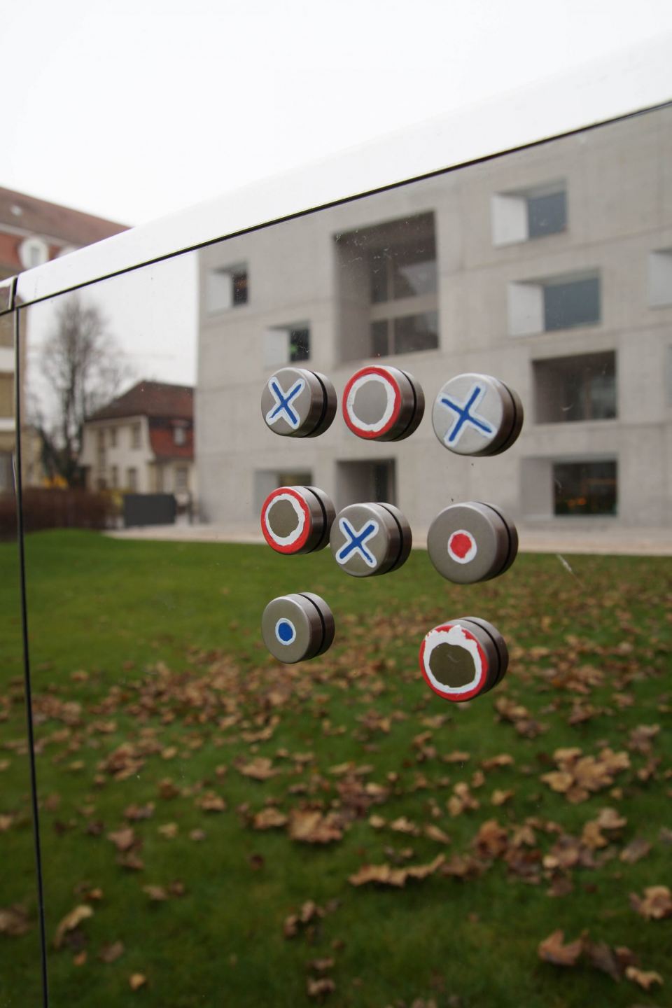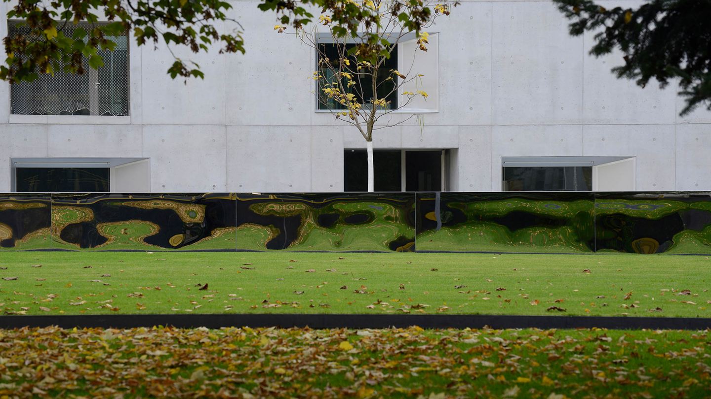 Die Gestaltung konzentriert sich vornehmlich an den Rändern. Eine Spielwand aus Holz, eine magnetische und industriepolierte edelstahlverkleidete Mauer und ein perforierter Heckenkörper, zeigen einen spielerischen Umgang mit dem Thema der Grenzen/Entgrenzung.