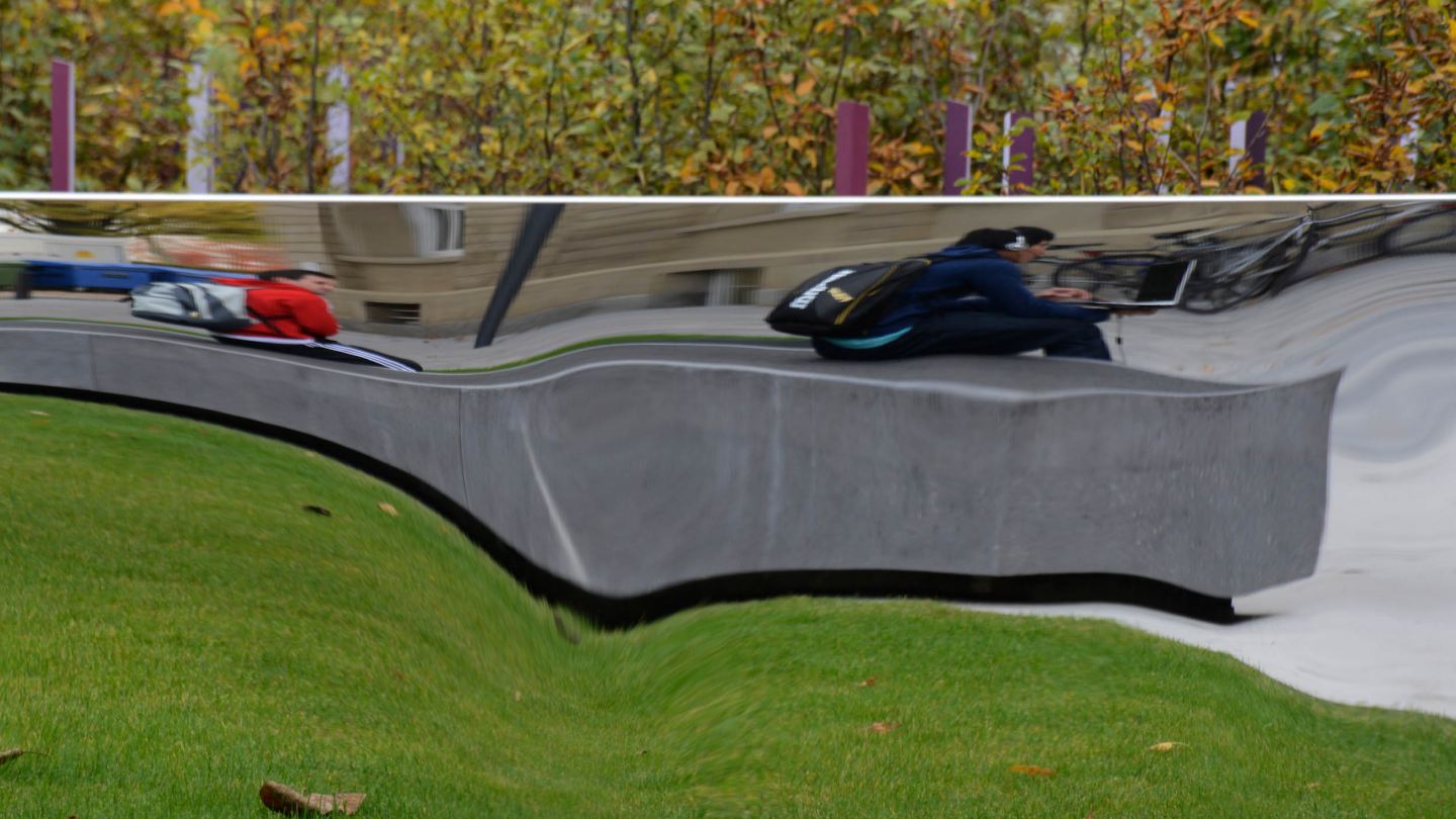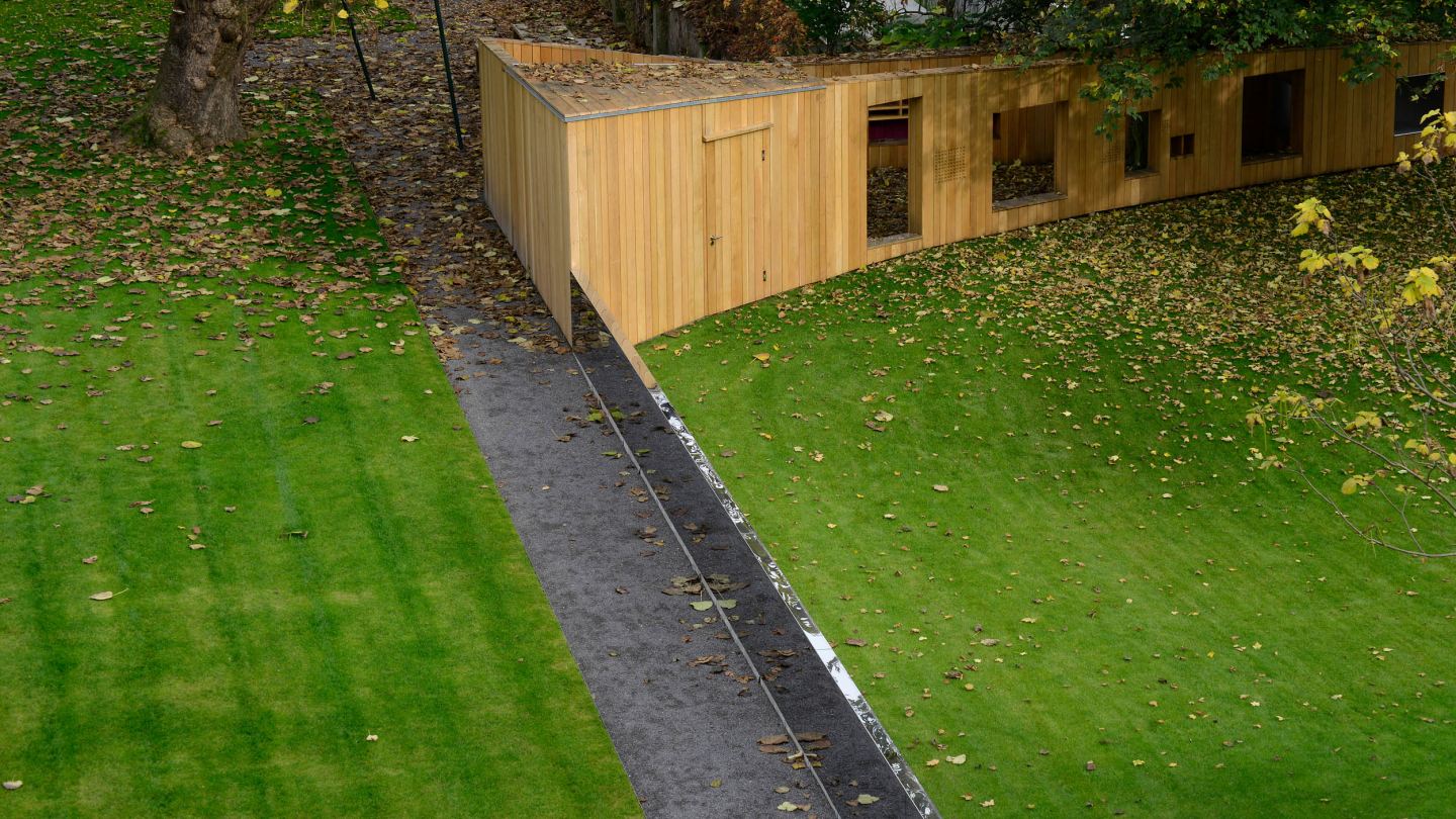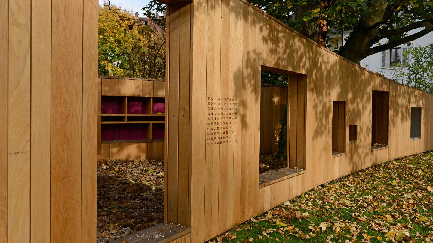 Die Gestaltung konzentriert sich vornehmlich an den Rändern. Eine Spielwand aus Holz, eine magnetische und industriepolierte edelstahlverkleidete Mauer und ein perforierter Heckenkörper, zeigen einen spielerischen Umgang mit dem Thema der Grenzen/Entgrenzung.
